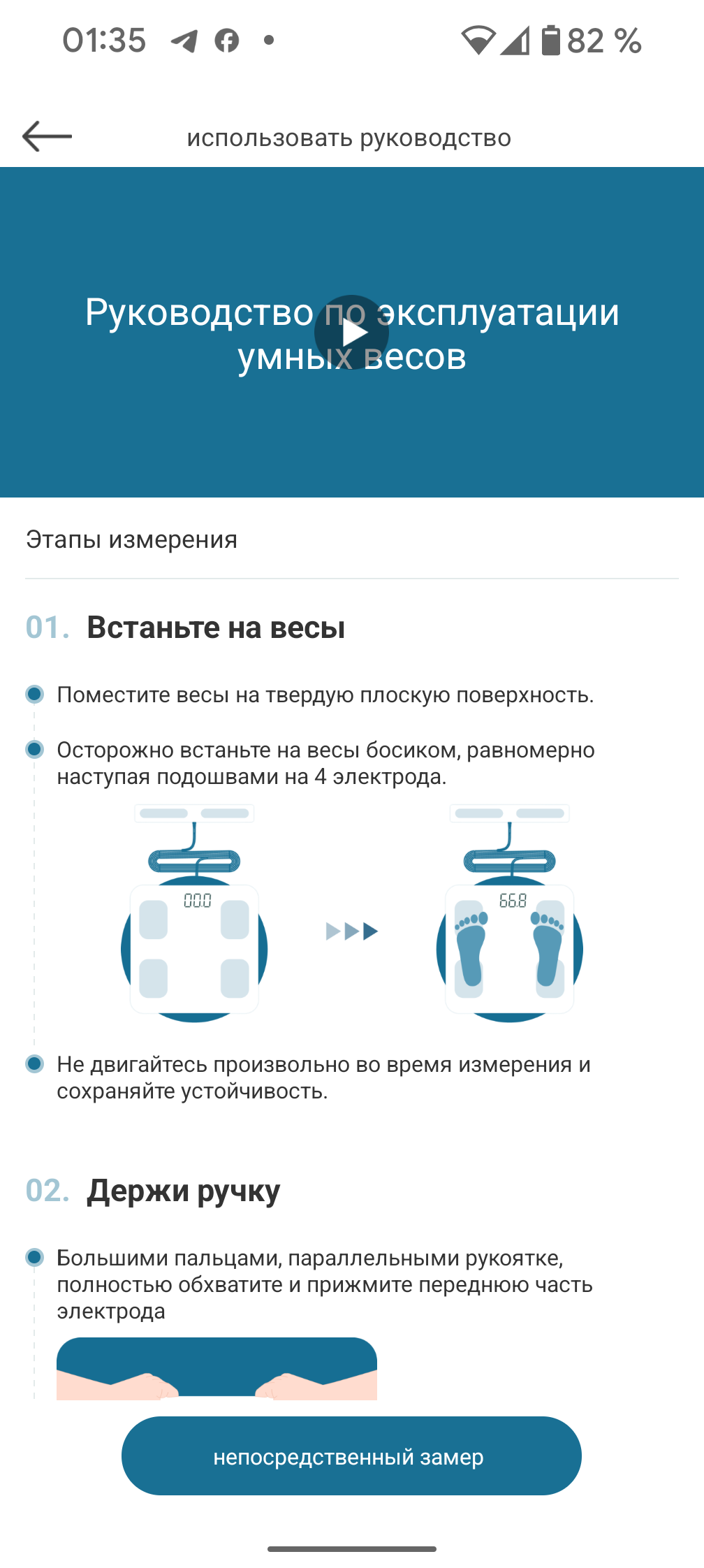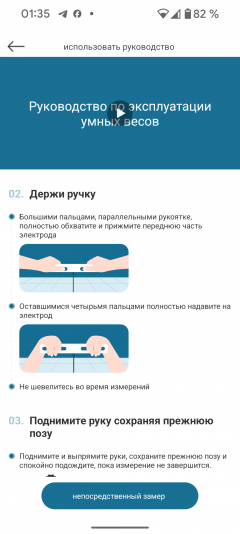Перед первым взвешиванием приложение подробно рассказывает, как правильно провести измерения тела. Пользователю необходимо встать на платформу, равномерно наступая босыми подошвами на все четыре электрода, взяться за ручку, выдвинув шнур на соответствующее росту расстояние и, удерживая ее всеми пальцами с обеих сторон, поднять руки на угол в 45° от тела.