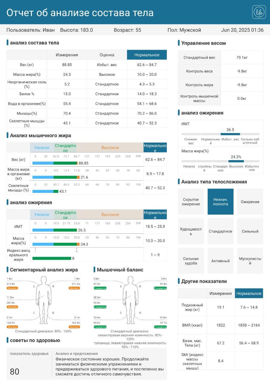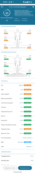 По окончании измерений мы получаем подробнейшую статистику о состоянии организма, еле умещающуюся на четырех экранах смартфона. Восемь электродов, участвующих в измерениях, дают возможность не только оценить общую массу жира и мышц, но и подробно рассмотреть их распределение.