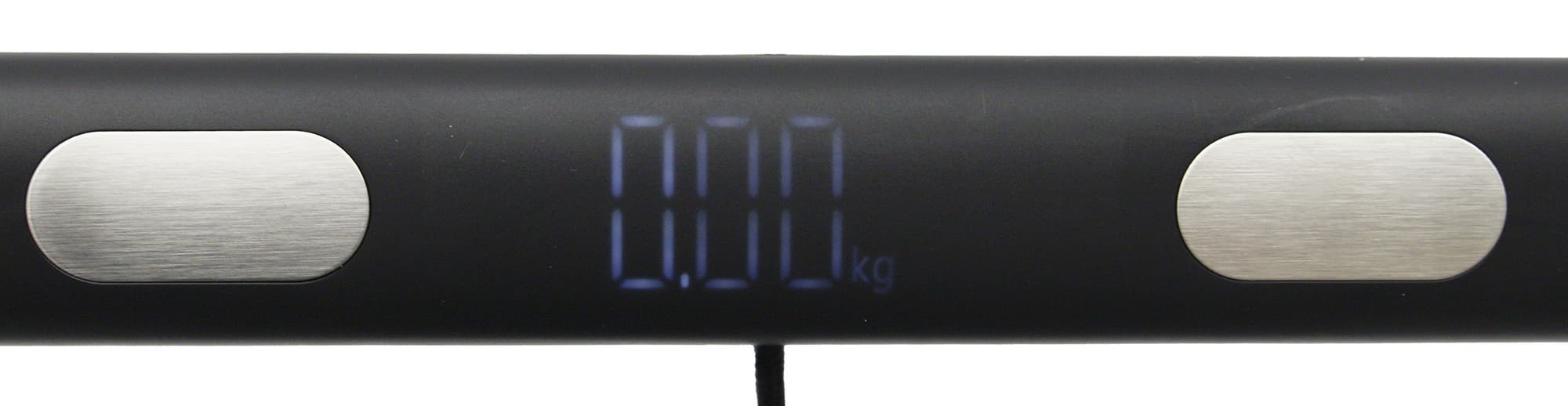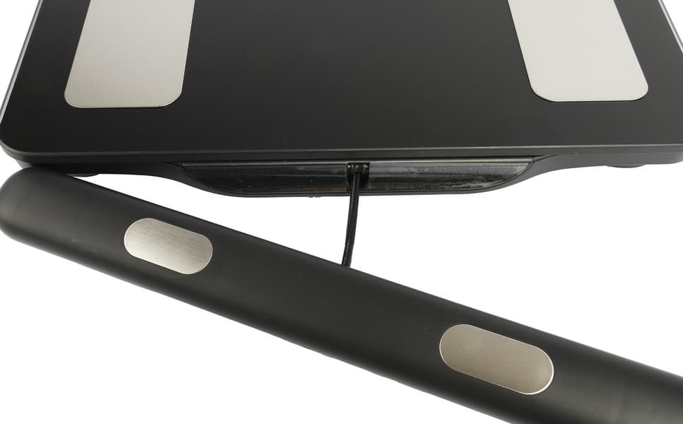В отличие от подавляющего большинства аналогичных устройств, эта модель снабжена также двумя парами дополнительных контактов для рук, расположенными на отделяемой от основного корпуса ручке. Электроды располагаются сверху и снизу рукоятки: они рассчитаны на захват обеими руками с двух сторон. Ручка соединяется с корпусом гибким проводом в текстильной оплетке, автоматически сматывающимся внутрь при отпускании устройства. Его длина (150 см) позволяет одинаково удобно использовать весы людям любого роста.