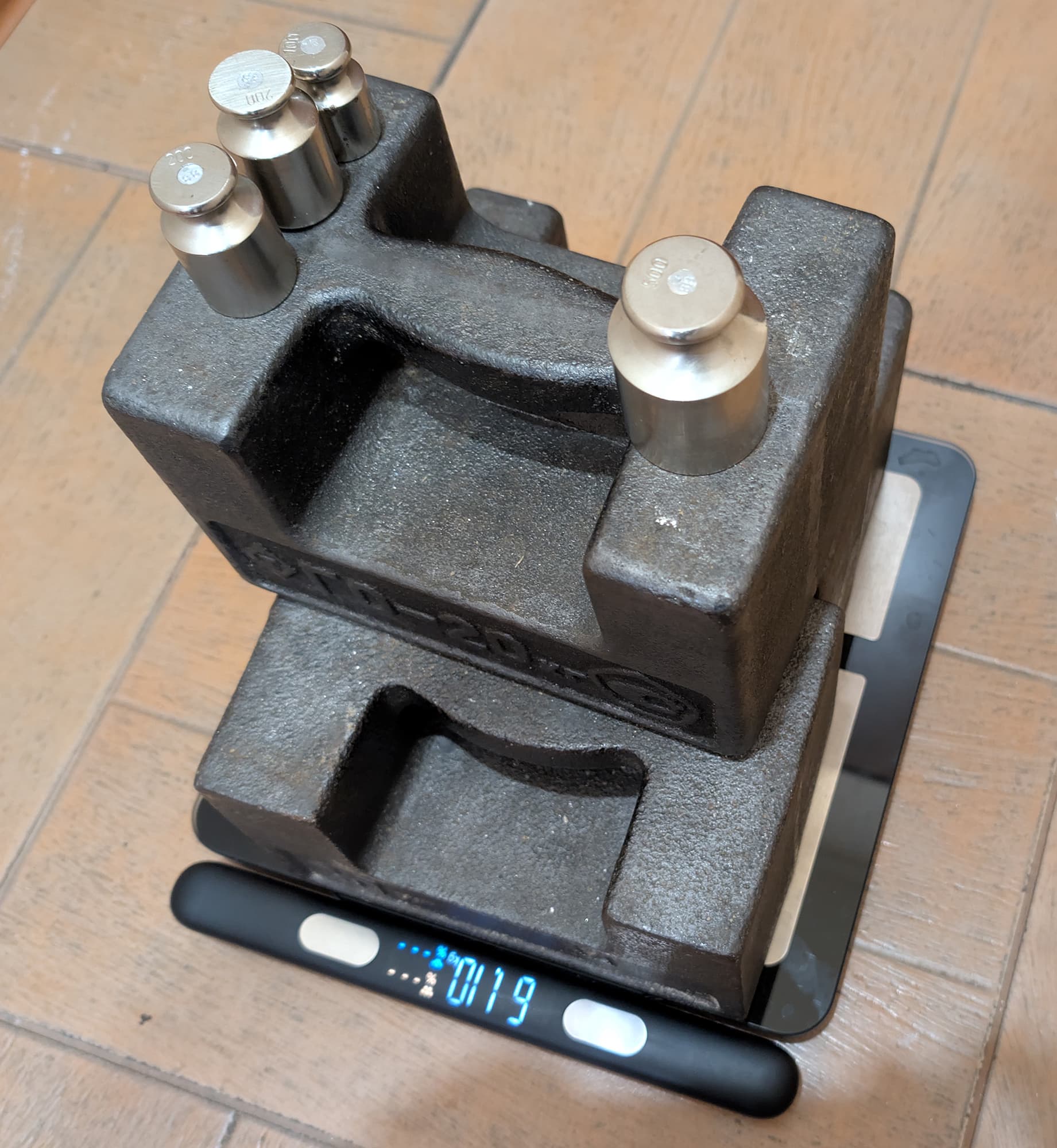 Чтобы оценить правильность показаний, мы воспользовались тремя 20-килограммовыми поверочными гирями класса точности М1 и набором лабораторных разновесов 4-го класса точности массой от 100 до 500 г.