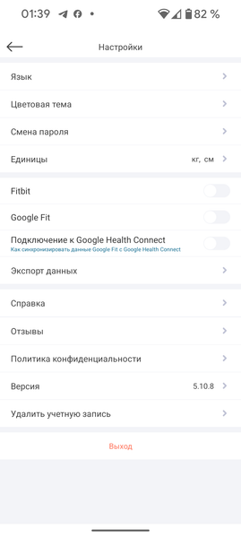 В настройках приложение позволяет изменить язык и цветовую тему, сменить единицы измерений, активировать синхронизацию измерений со сторонними приложениями (поддерживаются Google Fit/Health Connect и FitBit), экспортировать историю измерений в формате CSV (полезнейшая функция, не встречавшаяся нам ранее в аналогичных приложениях!), обратиться к онлайн-документации, ознакомиться с политикой конфиденциальности а также, при необходимости, — удалить учетную запись.