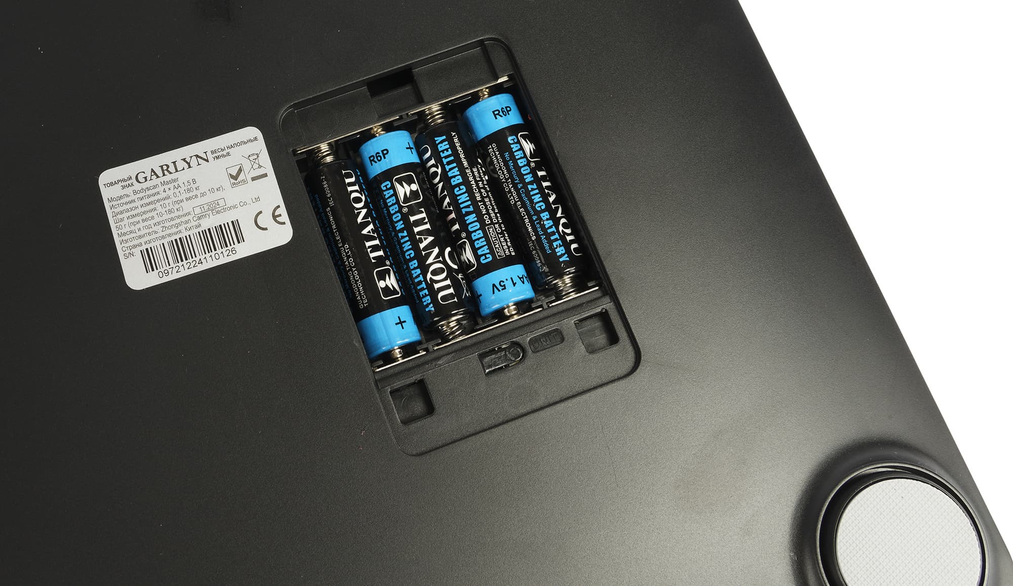 Весы питаются от четырех «пальчиковых» батареек типа АА, они входят в комплект устройства. Под крышкой батарейного отсеке располагается также кнопка изменения единиц измерения веса: по умолчанию наше устройство показывает его в килограммах, но при желании можно переключить их на фунты или стоуны.