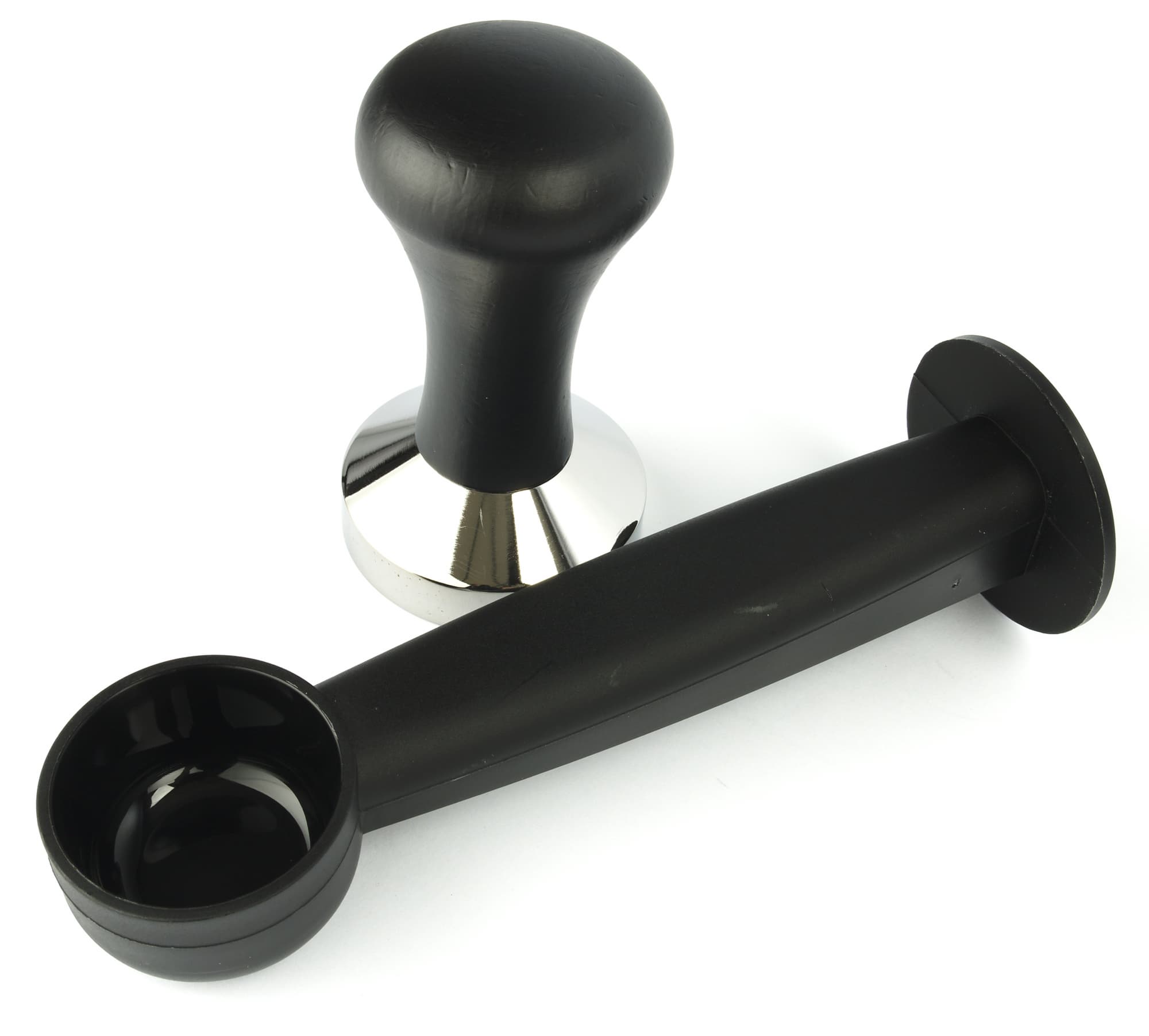 К кофеварке прилагается не только обычная пластиковая ложка с уплотнителем, но и стальной темпер — аксессуар, который нечасто встретишь в коробках с устройствами подобной ценовой категории.