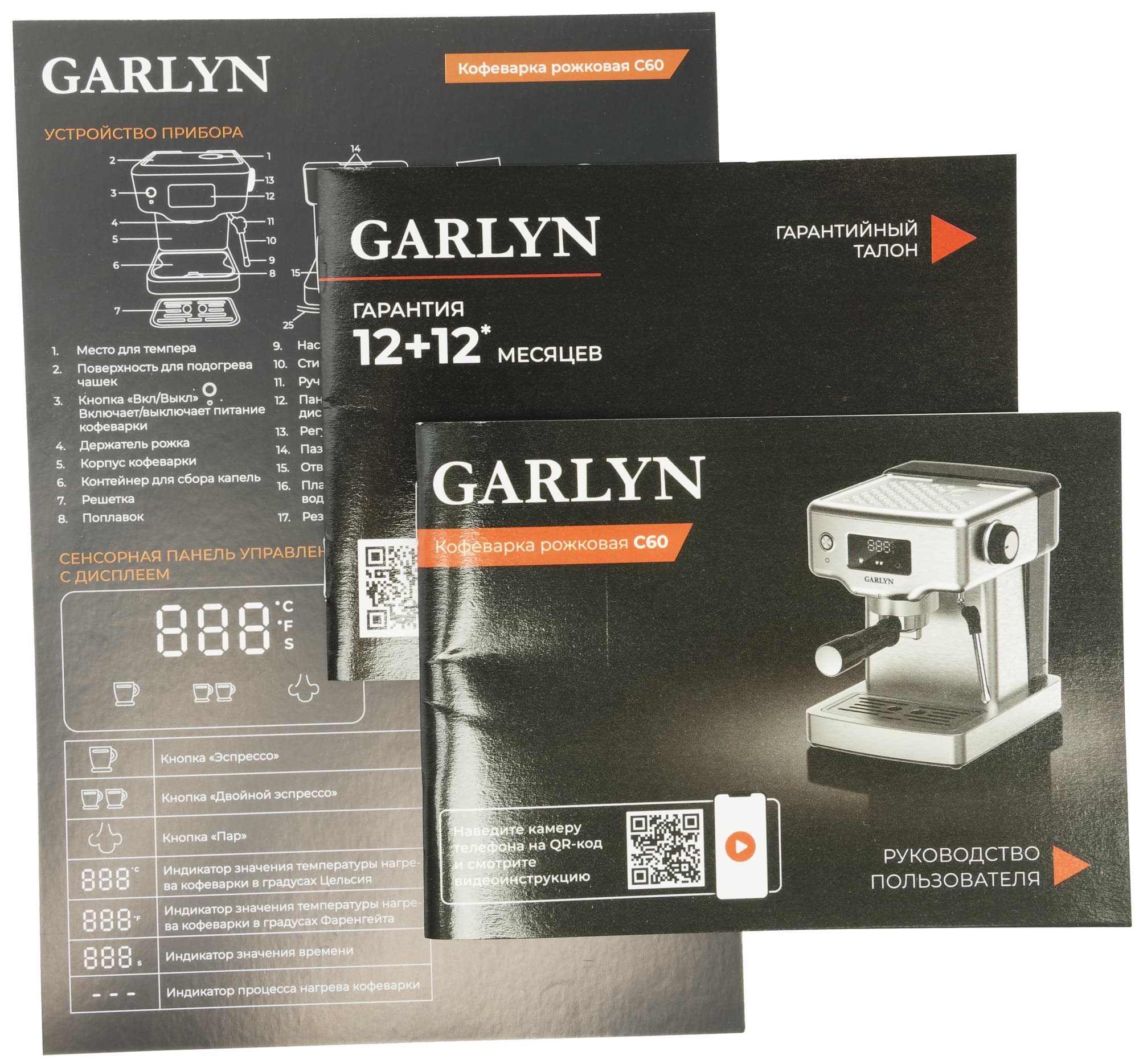Комплектация Garlyn C60 вполне обычна для устройств этого типа за небольшим исключением: производитель добавил в нее неплохой стальной темпер. Это приятно, потому что обычно к бюджетным кофеваркам этот аксессуар приходится докупать самостоятельно.