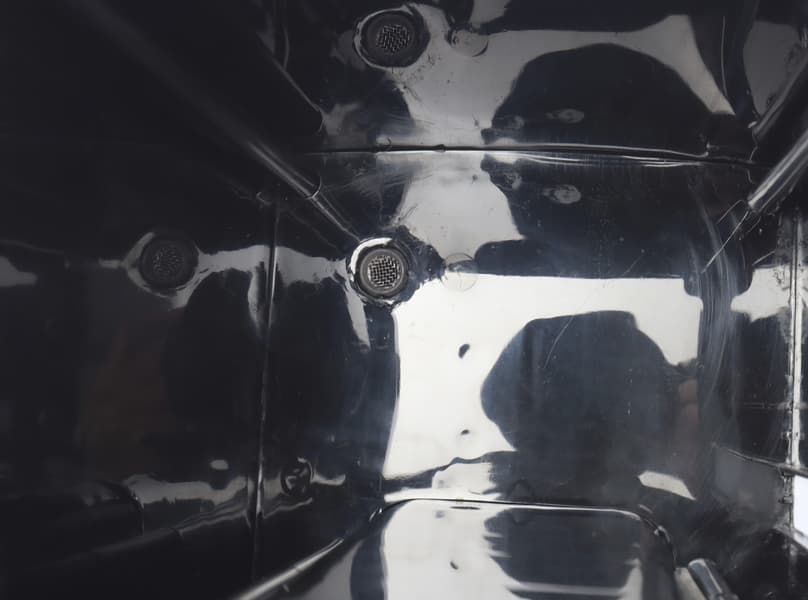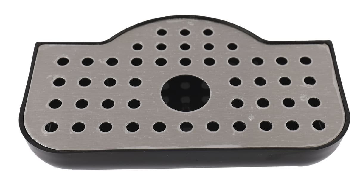 Съемный поддон для сбора капель выполнен из черного пластика, сверху закрывается металлической решеткой. Он достаточно вместительный, в него помещается до 100 мл жидкости. Одна из сторон решетки покрыта защитной пленкой. Она настолько тонкая, что мы не сразу заметили, пока от воды она немного не вспучилась, чем напомнила о себе. Ее основная функция — защита детали от повреждений до использования.