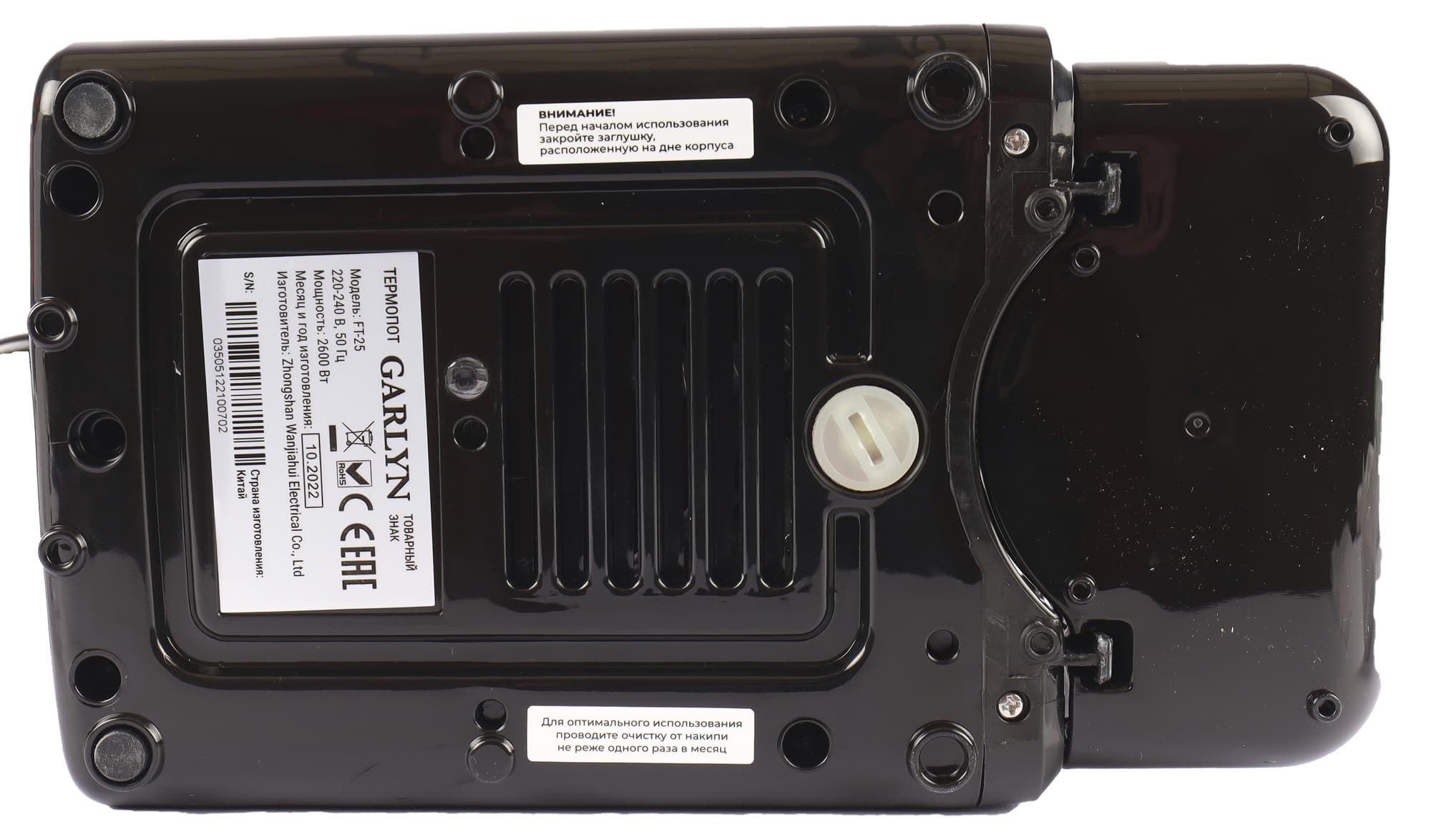 Упакован прибор сразу в две аккуратные коробки. Внешняя — крафтовая, с рисунком и названием модели на стенках. Внутри фирменная, в черно-красных тонах бренда. На ней фотография Garlyn FT-25, характеристики, отдельно вынесены преимущества данного термопота. На одной из узких стенок — рекламные ракурсы FT-25 и QR-код, ведущий на сайт Garlyn. Внутри агрегат защищает пенопластовый ложемент.