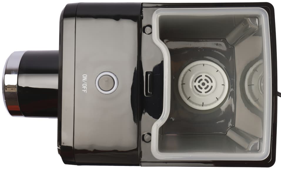 Черный резервуар в 2,5 л расположен в задней части устройства. На белой, полупрозрачной шкале нанесена разметка: 0,5, 1, 1,5, 2 и 2,5 л. Плохо, что она выполнена из того же пластика, что и вся шкала, и не очень легко различима. Важно, чтобы вода не опускалась ниже отметки в 0,5 л и не поднималась выше максимума в 2,5 л. У Garlyn FT-25 есть блокировка включения без воды и автоотключение, но невзрачность градирования всё равно расстроила.