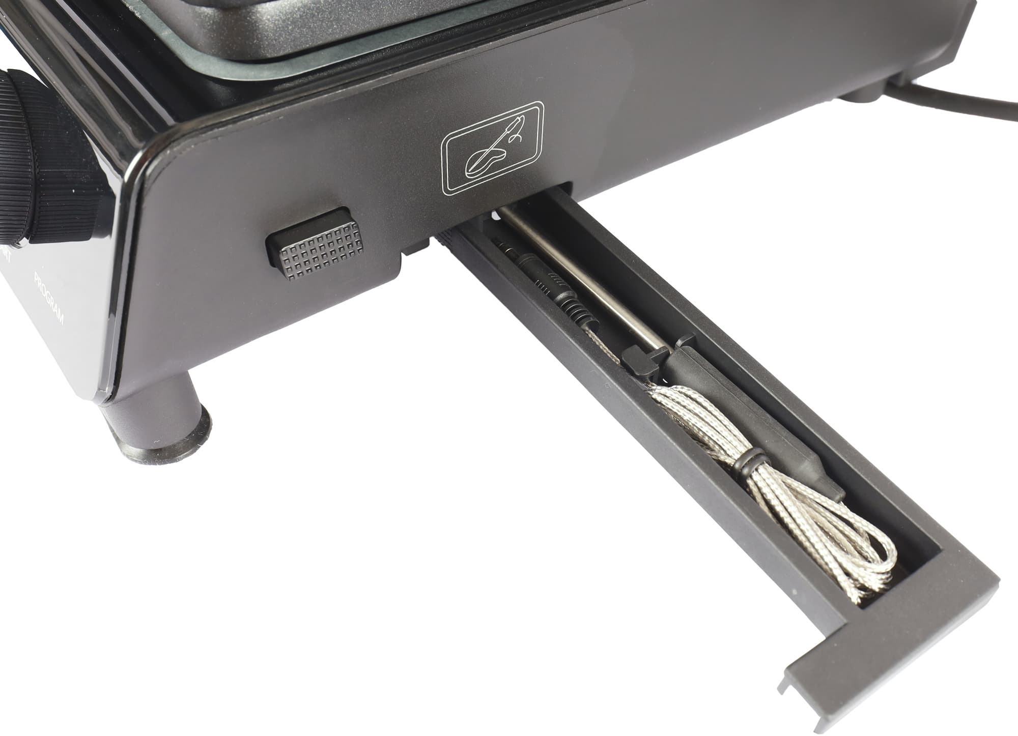 В емкости лежит присоединяемый термощуп. Гнездо для него открывается при выдвижении емкости, оно снизу слева. Термощуп работает только на программах жарки мяса.