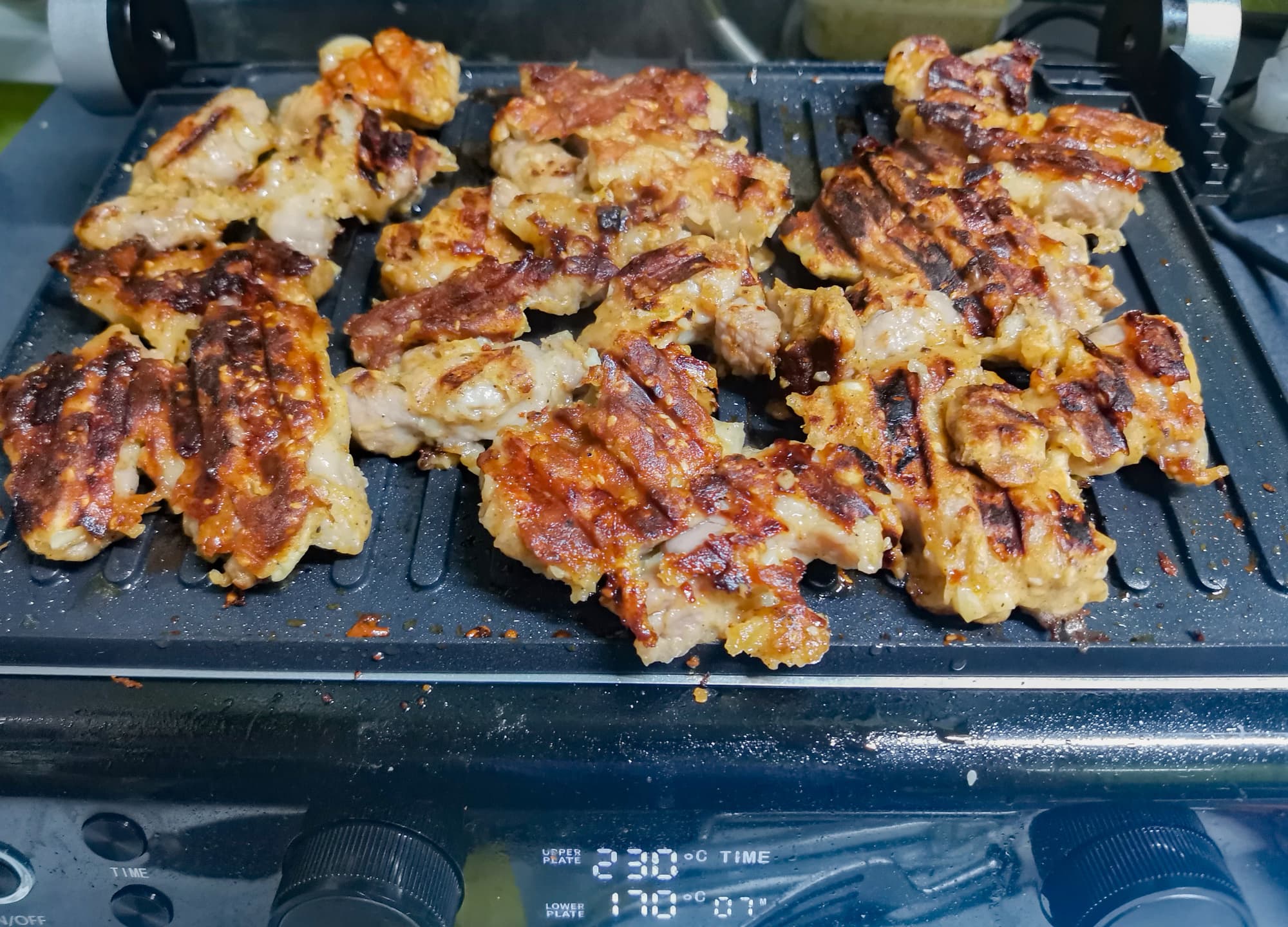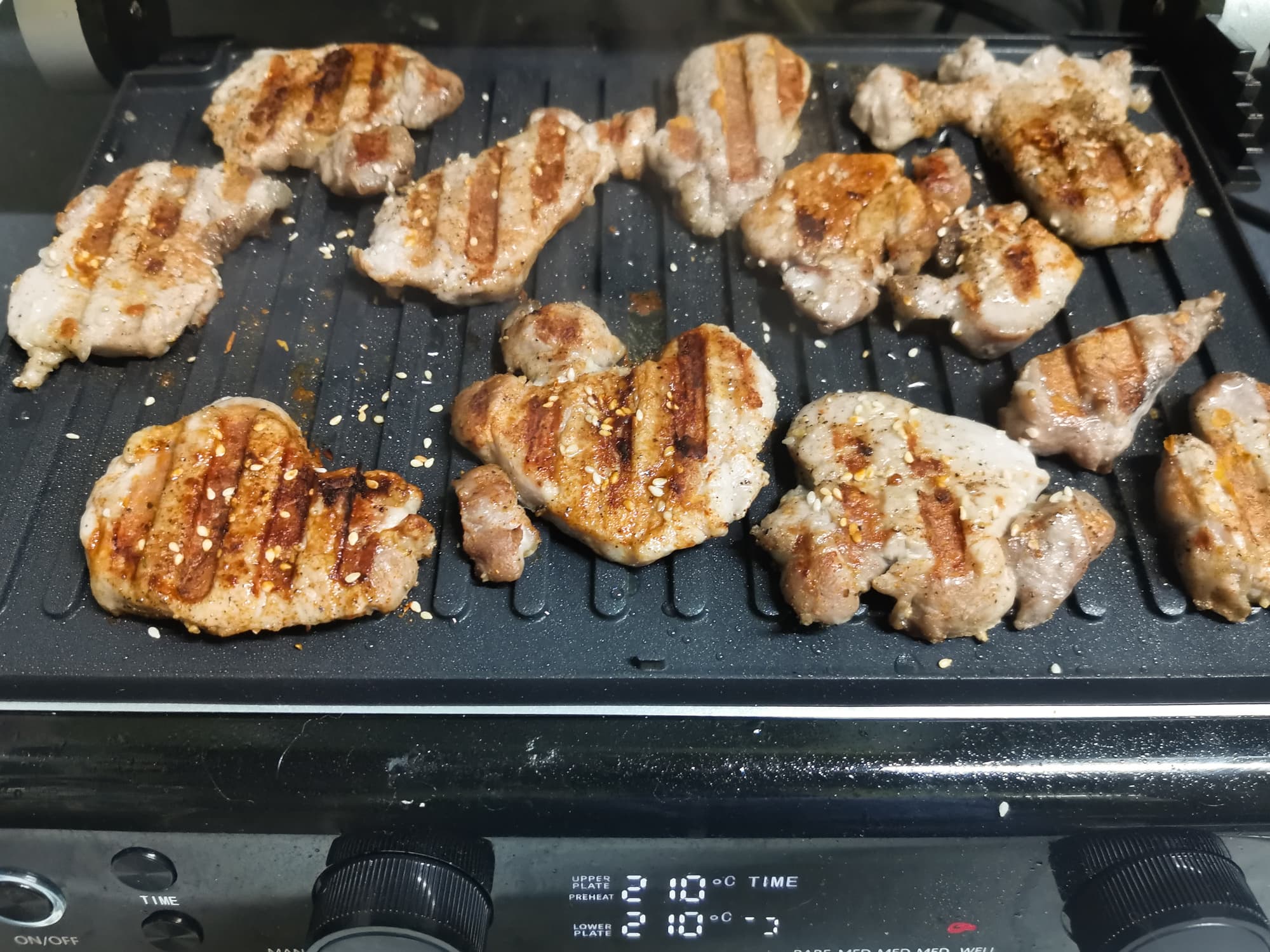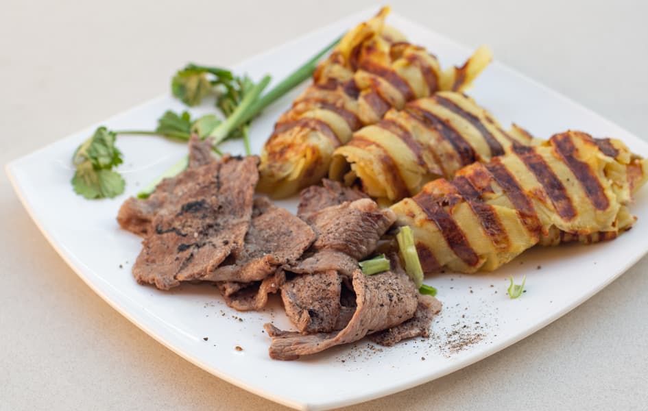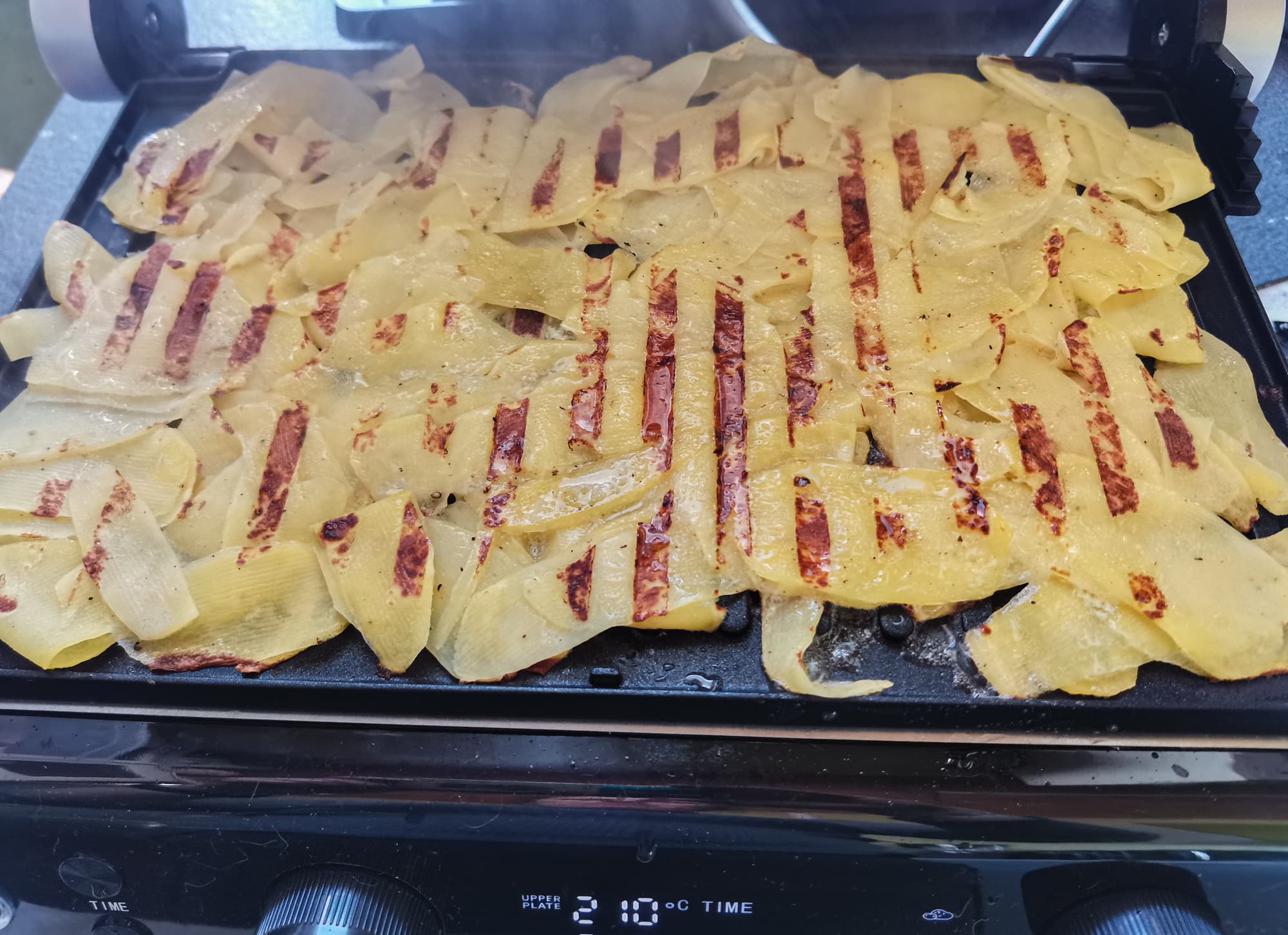 Гриль позволяет готовить картошку и мясо разными способами. Температуры панелей хватает для одновременного приготовления, для запечатывания мяса и для хорошей прожарки толстого слоя картошки.