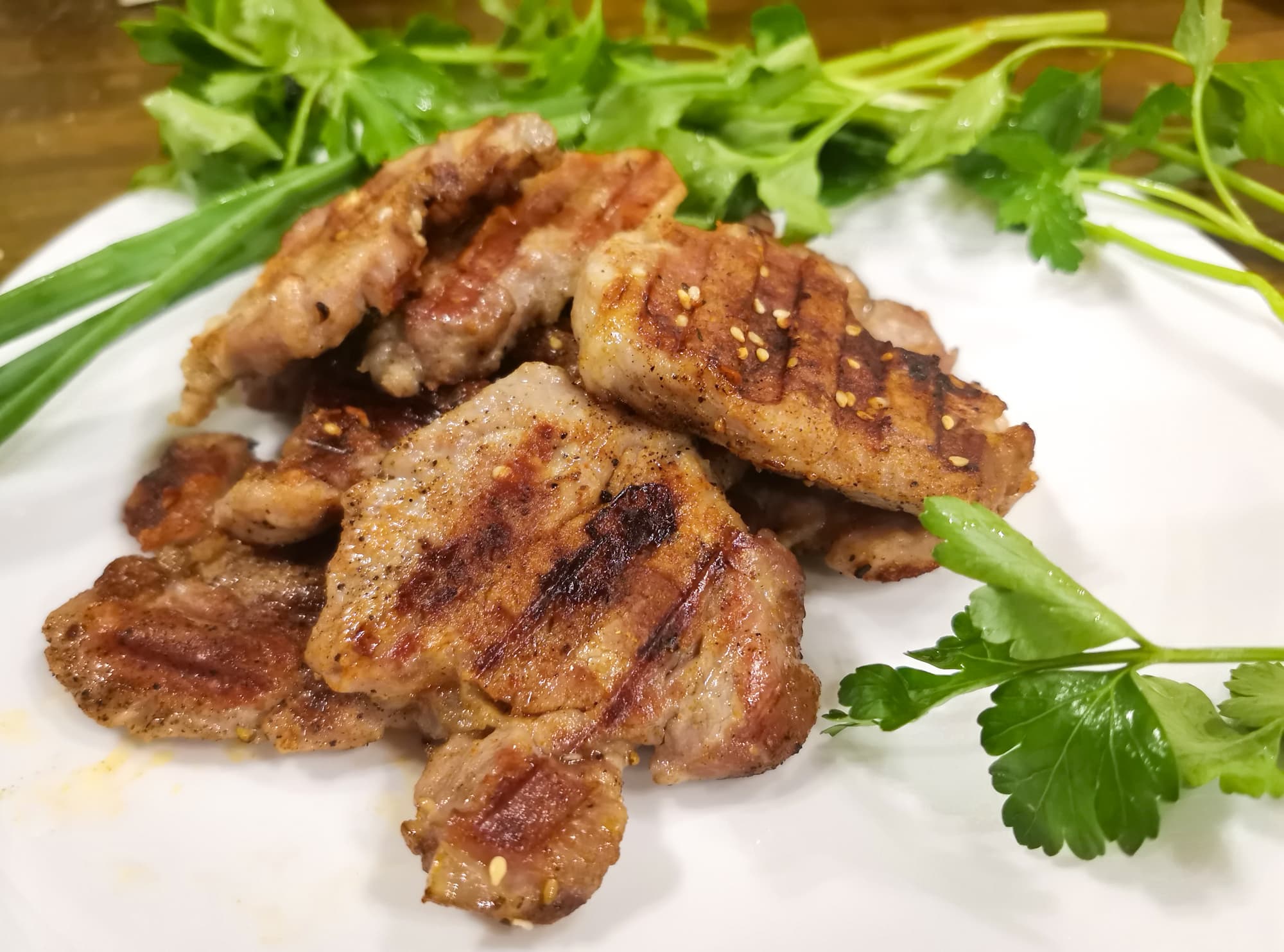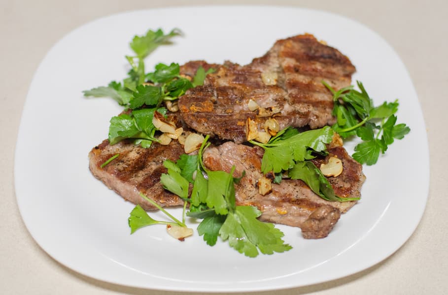 Готовили без щупа, так как куски недостаточно толстые для него, но проверяя готовность. После готовности посыпали чесноком и еще дожарили в течение минуты.