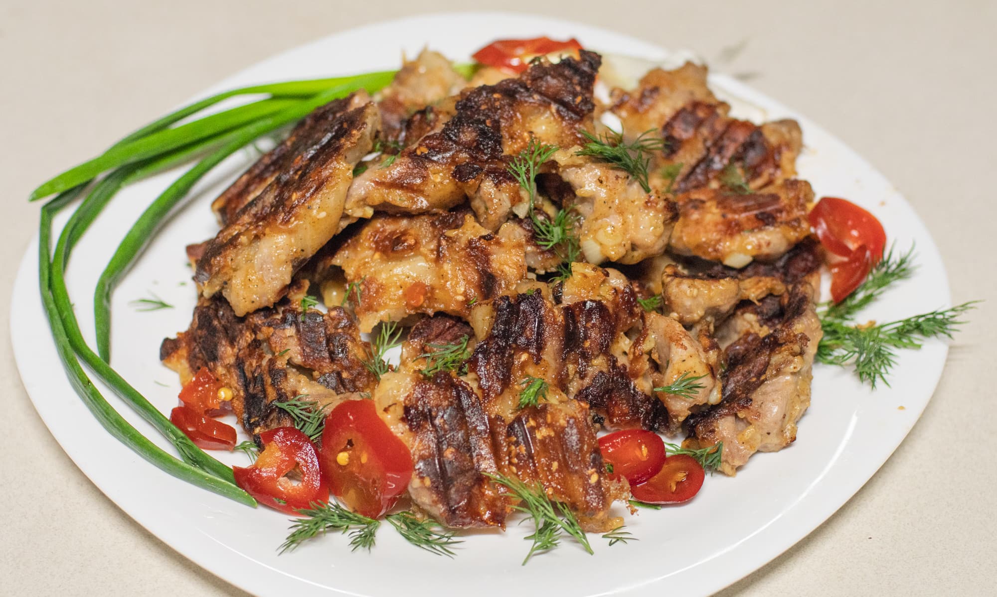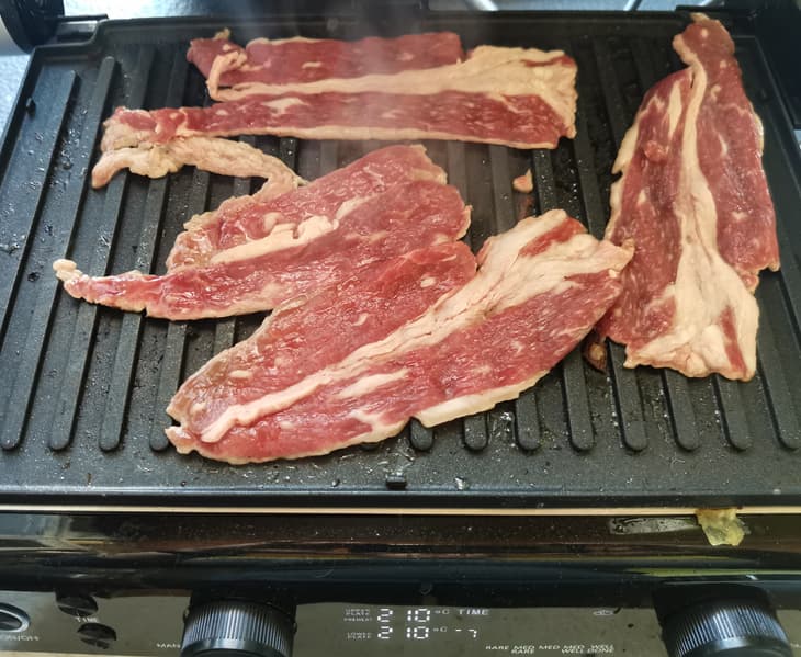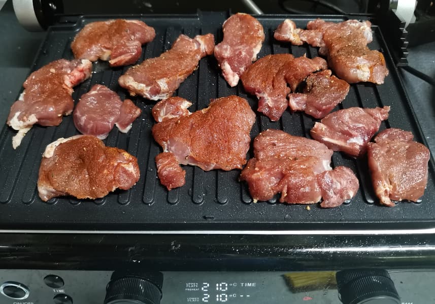 Для начала мы взяли свиную вырезку, нарезали кусочками, обваляли в специях и выложили на гриль на программу мяса сильной прожарки.