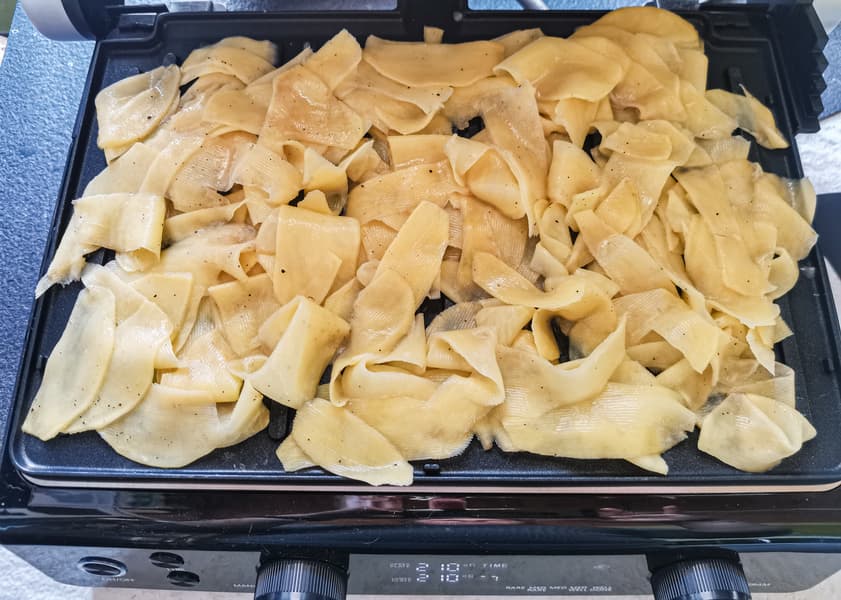 На панели-гриль, смазанные маслом, мы выложили слой тонко нарезанной картошки в соли и специях.