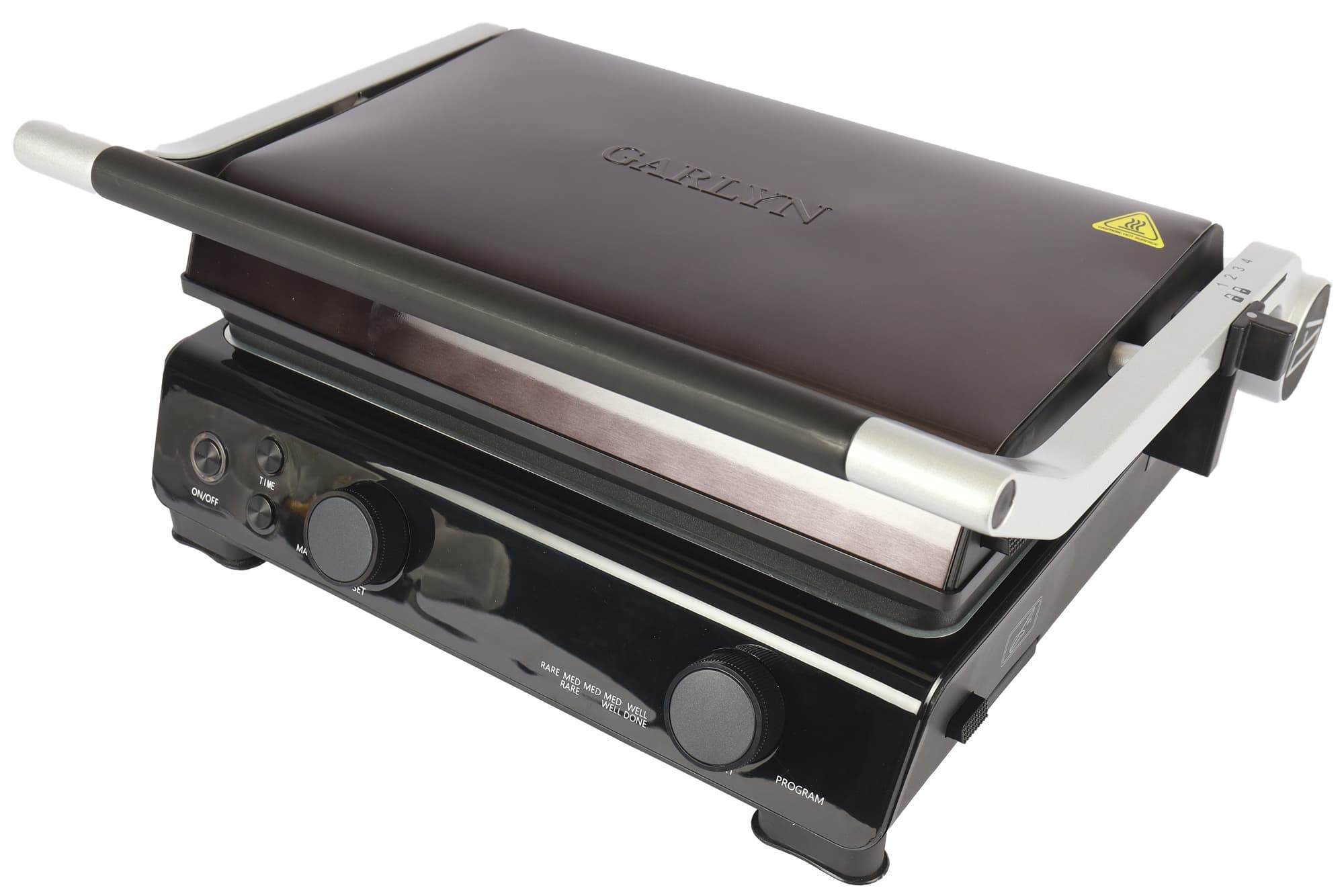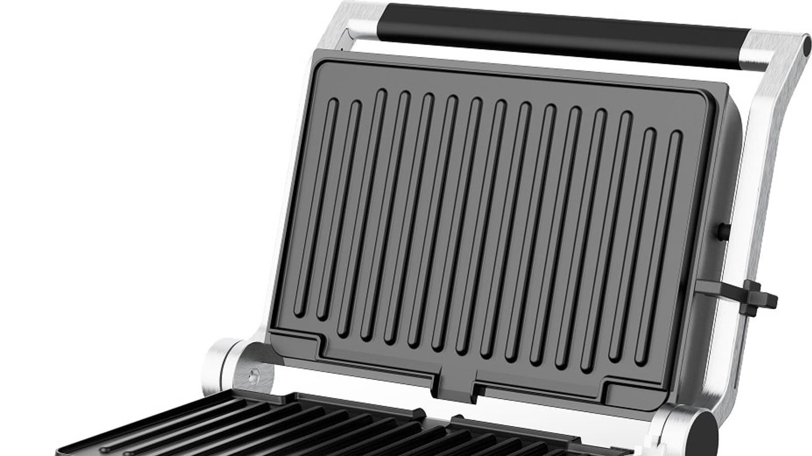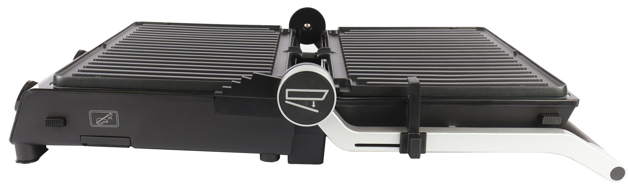 При нажатии на большую кнопку, расположенную сбоку ручки, прибор можно открыть на 180°. Таким образом его можно использовать как настольное барбекю. При закрытии кнопку тоже нужно нажать, иначе ручка останется в заблокированном положении.
