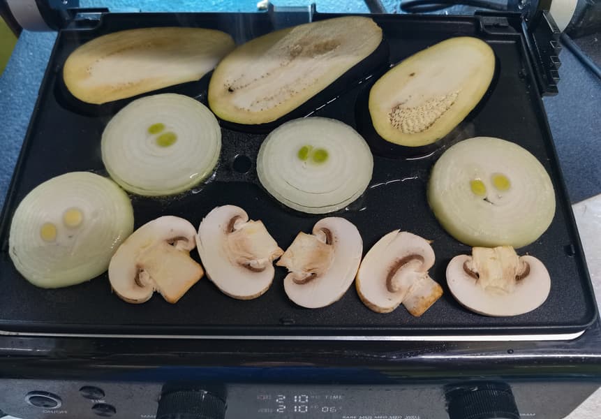 Свежие баклажаны, лук и шампиньоны порезали произвольными кусками, но стараясь сохранить примерно одинаковую толщину. Выложили на гриль, смазанный маслом. Выставили температуру 210 °C на обеих панелях.