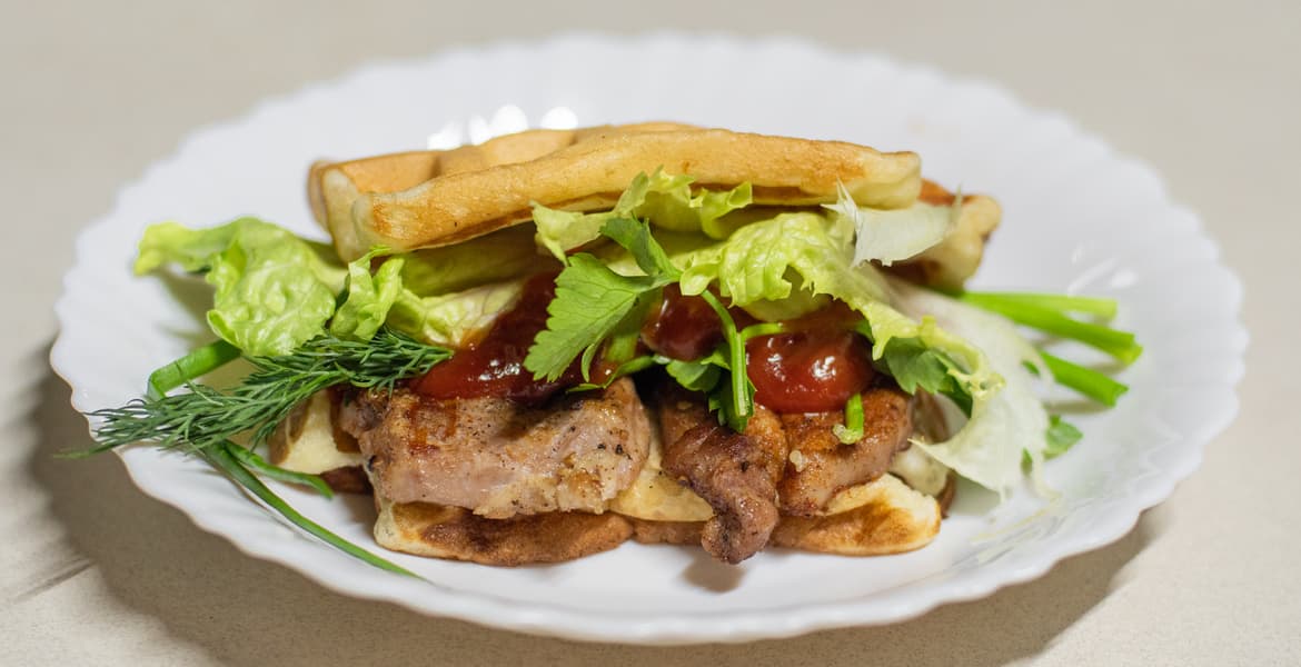 Из получившихся вафель, сыра, зелени и котлет сделали бургеры.