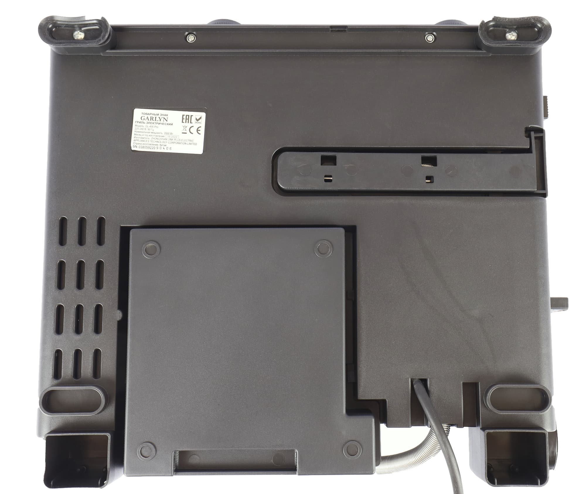 Снизу прибора наклейка с серийным номером. Стоит гриль на четырех нескользящих пластиковых ножках.