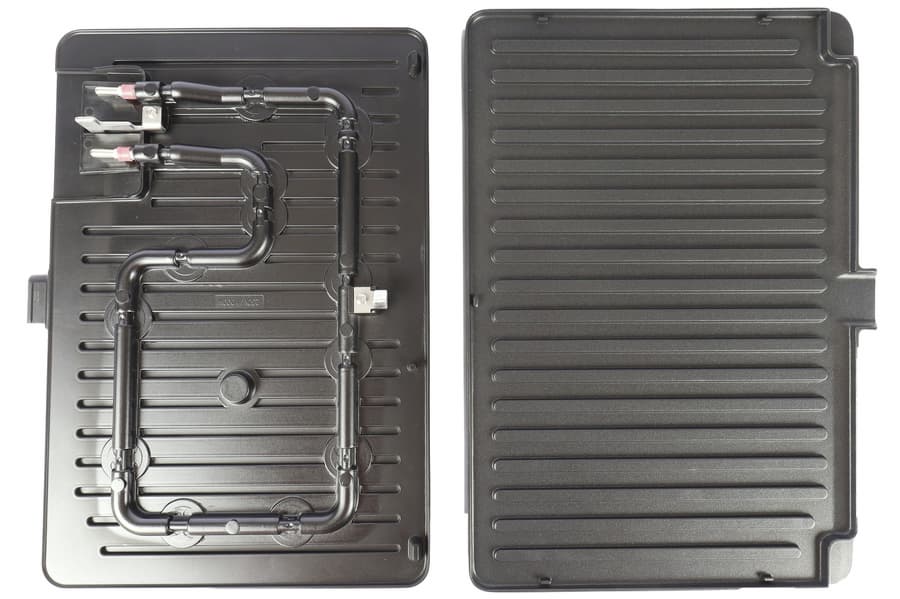 Съемные панели Garlyn GL-400 Pro имеют встроенный нагревательный элемент. Сами панели сделаны из толстого металла и покрыты антипригарным покрытием, внешний вид которого создает впечатление надежности и долговечности. В комплекте к прибору поставляется пять панелей. Две из них, с ребристой поверхностью, наилучшим образом подходят для приготовления стейков, курицы, овощей, гамбургеров.
