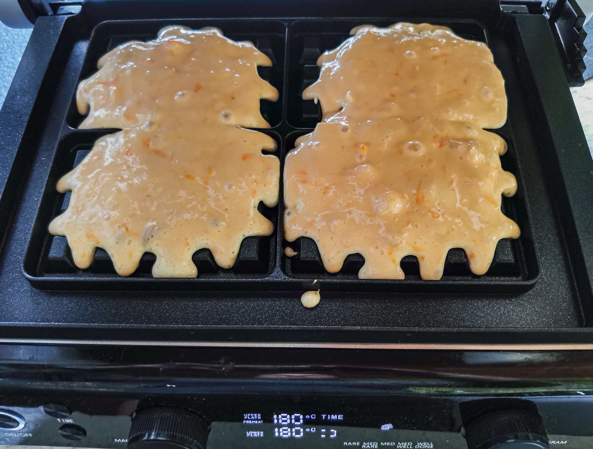 Готовые котлеты, сыр и зелень отложили в сторону. Сменили панели на панели для вафель.