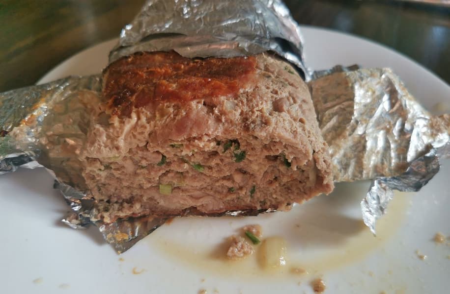 Говяжий фарш с добавлением мелко нарубленной свинины, яйца, зелени и специй сформировали в рулет и завернули в несколько слоев фольги. Рулет уложили на гриль, панели для гриля. Подключили термощуп гриля и тестовый термощуп, воткнули рядом. Выставили программу мяса с прожаркой Med Well.