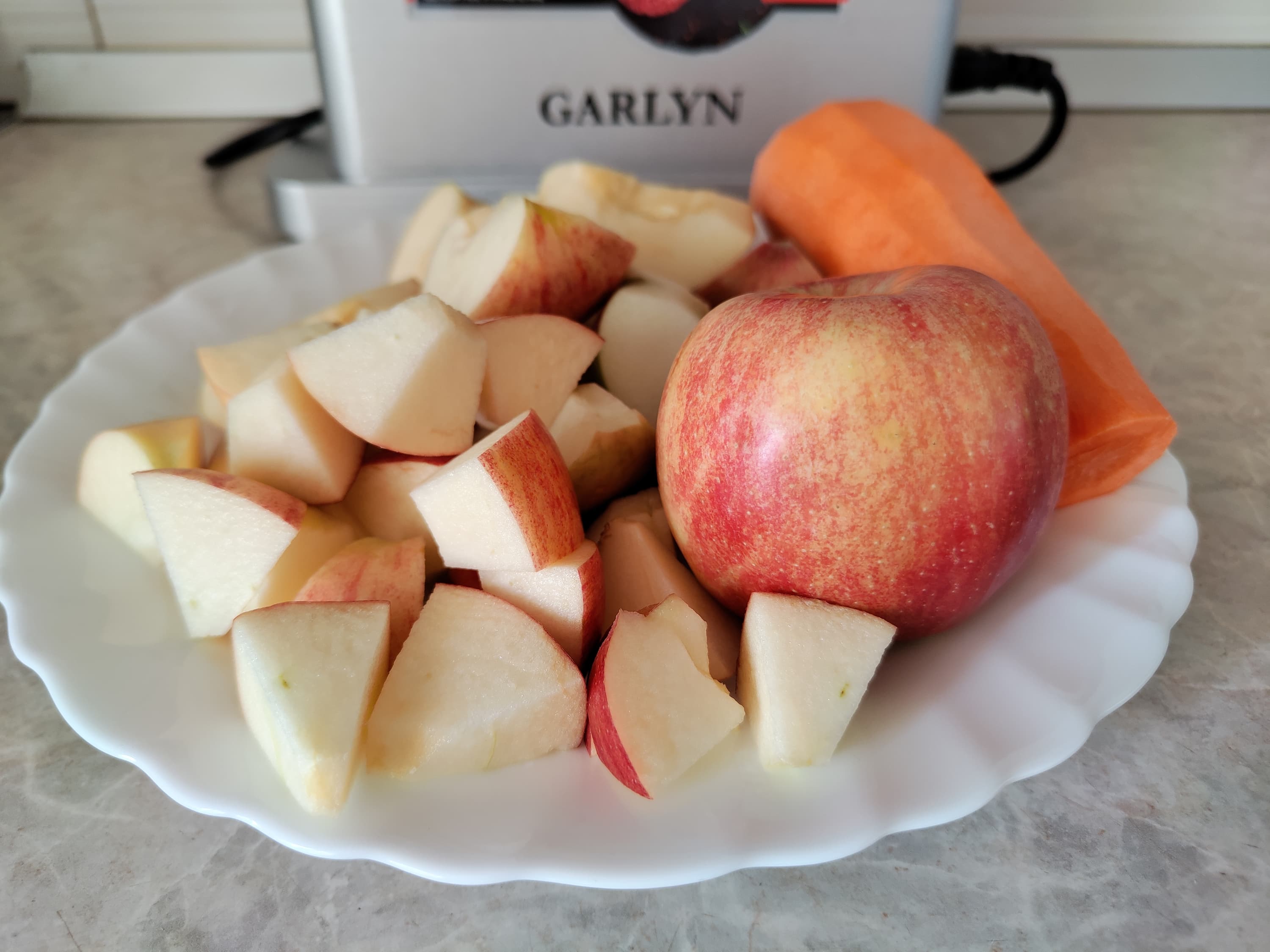 В инструкции указано, что насадка-соковыжималка не подходит для отжима твердых овощей, но мы не могли не попробовать (у нас стресс-тесты!), тем более на дисплее указано, что первая скорость подходит для отжима сока из моркови. Мы не знали, чему верить — слову печатному или слову на экране, поэтому морковному соку быть!