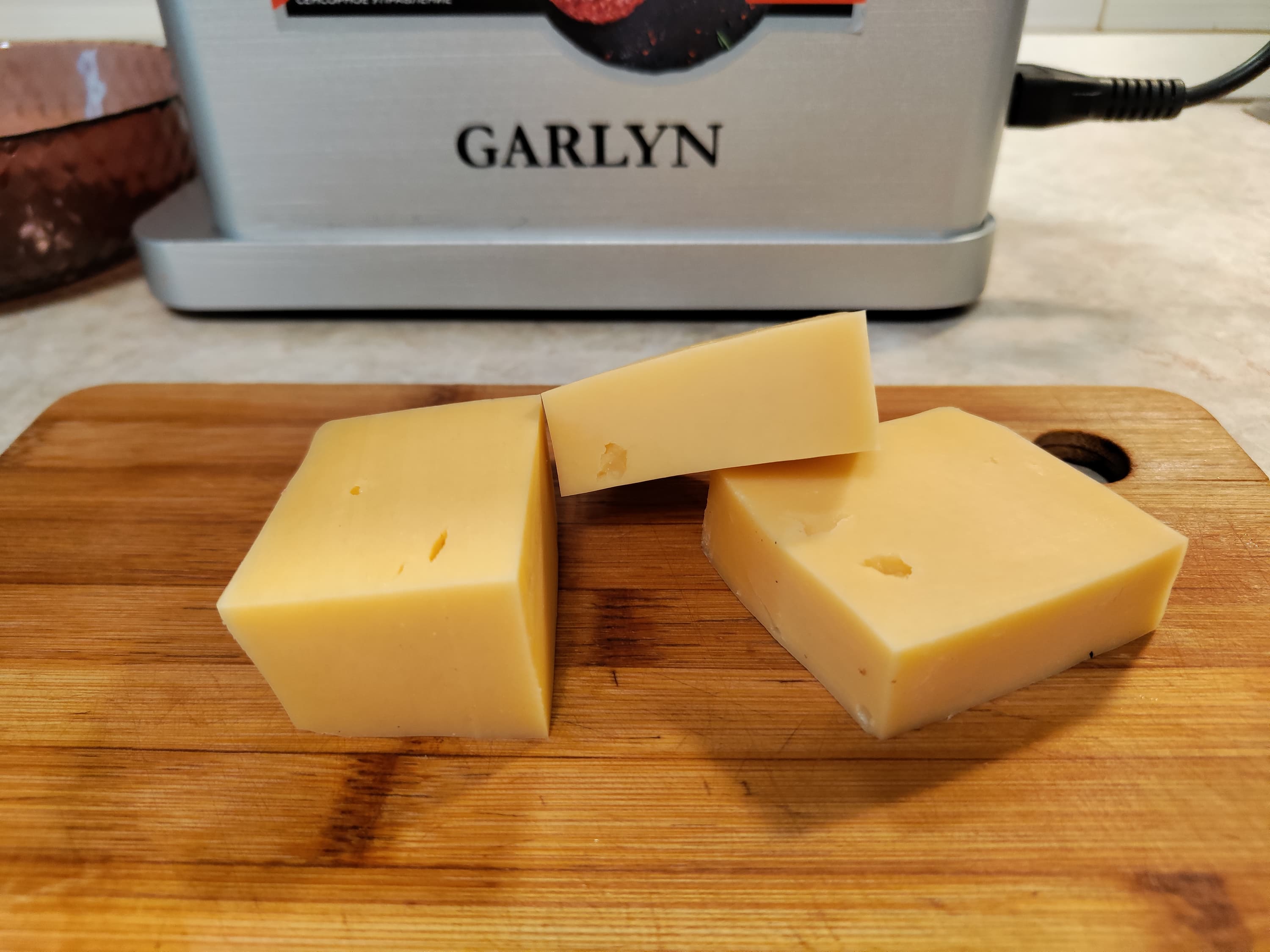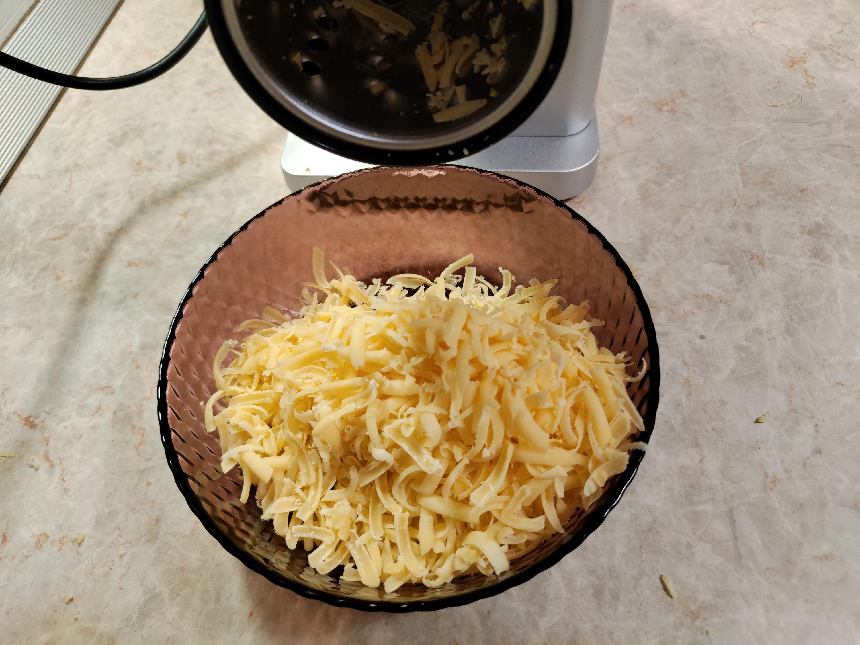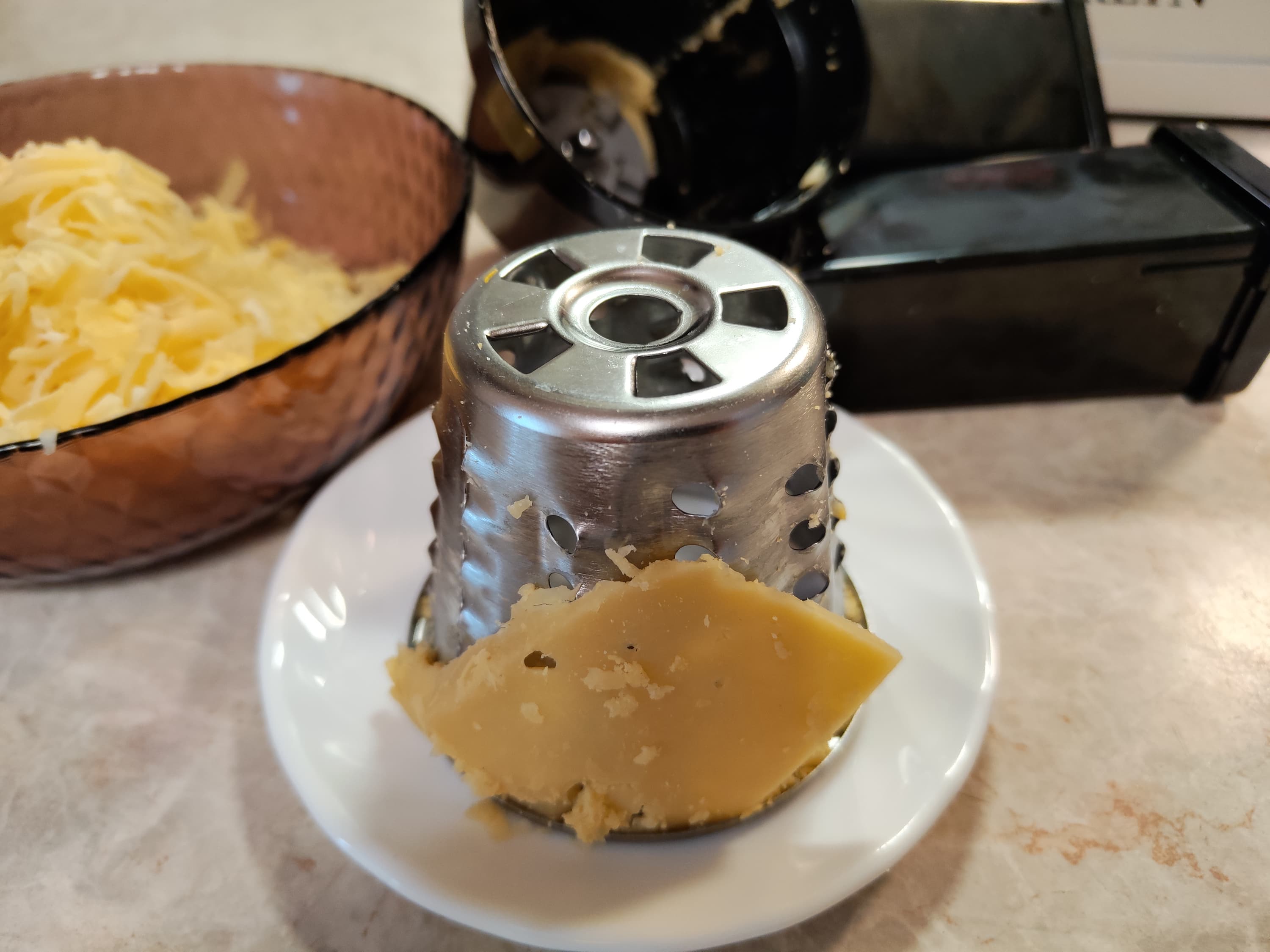 Полутвердый сыр нарезали на куски, свободно проходящие в загрузочное отверстие насадки-терки.