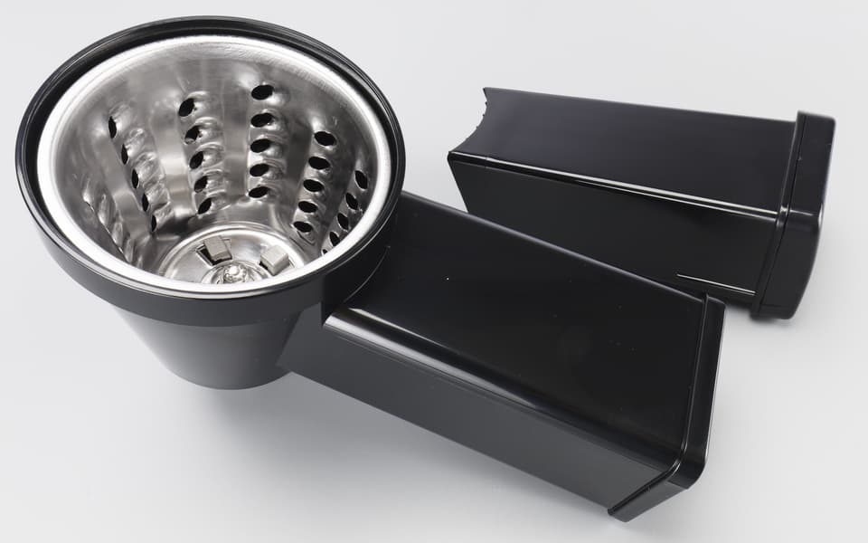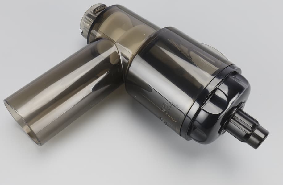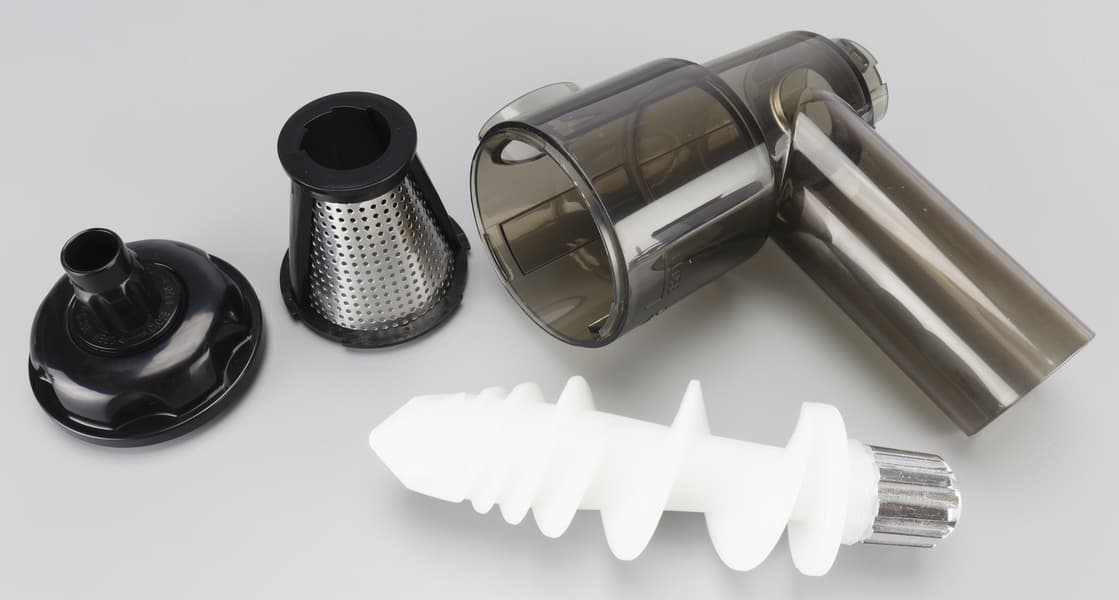 Насадка-соковыжималка стандартной для шнековой соковыжималки конструкции состоит из нескольких деталей, соединяющихся между собой интуитивно понятным образом. Все детали, за исключением металлических задней части шнека и перфорированной вставки-сита, пластиковые.