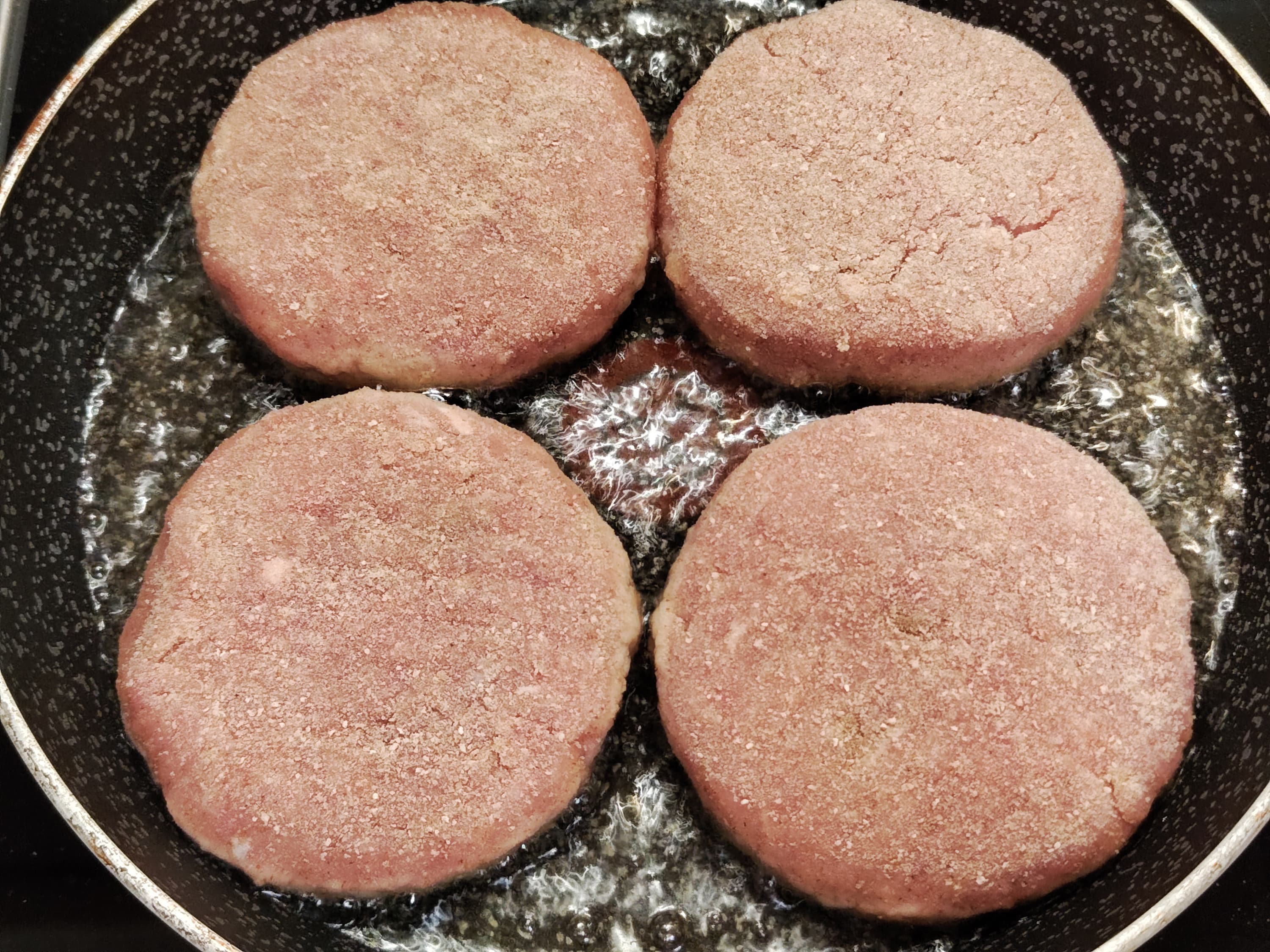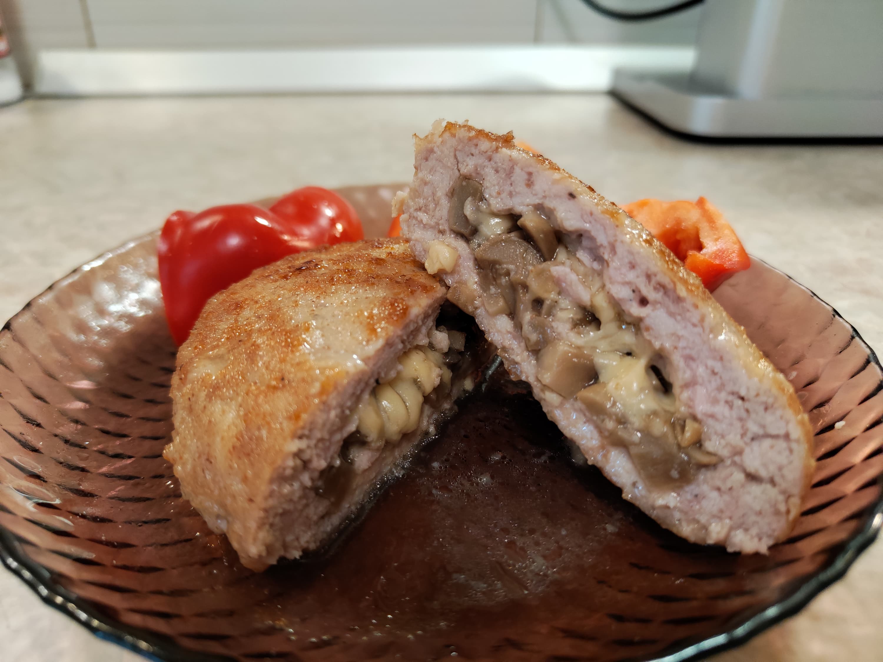 Далее мы наконец добрались до бургер-пресса. Смачивали руки холодной водой, формовали комок фарша, укладывали его в большой цилиндр, в котором предварительно размещали дно. Немного прижав мясо пальцами, надавливали прессом. Получалось ровное красивое углубление, которое заполняли жареными грибами, сверху посыпали сыром. Затем отрывали кусочек фарша поменьше, формовали, прихлопывая, лепешку и размещали ее сверху. Опять придавливали прессом, точнее снятой от него крышкой большого диаметра. Всё происходило довольно быстро, описывать процесс сложнее, чем лепить зразы с помощью бургер-пресса.