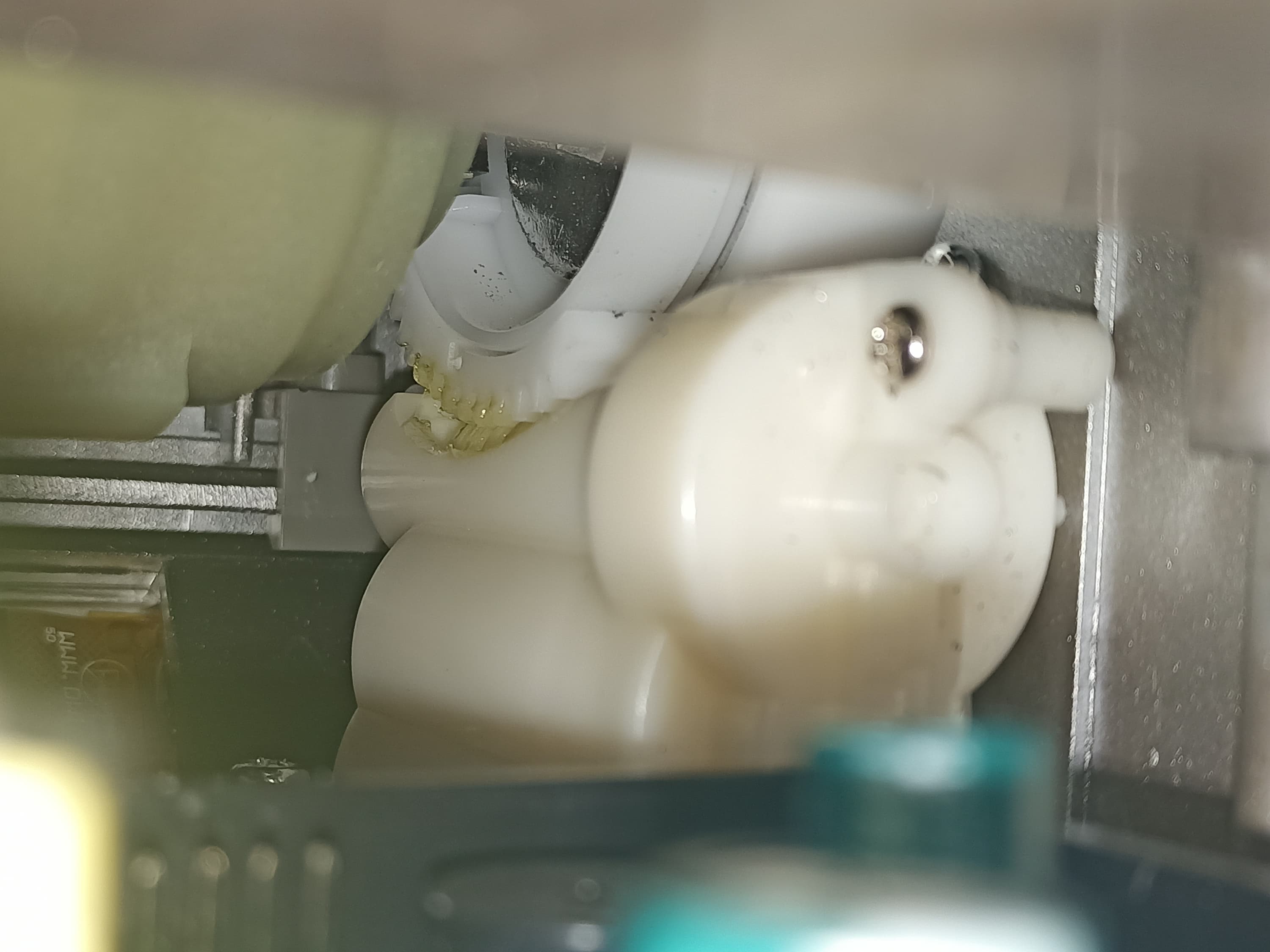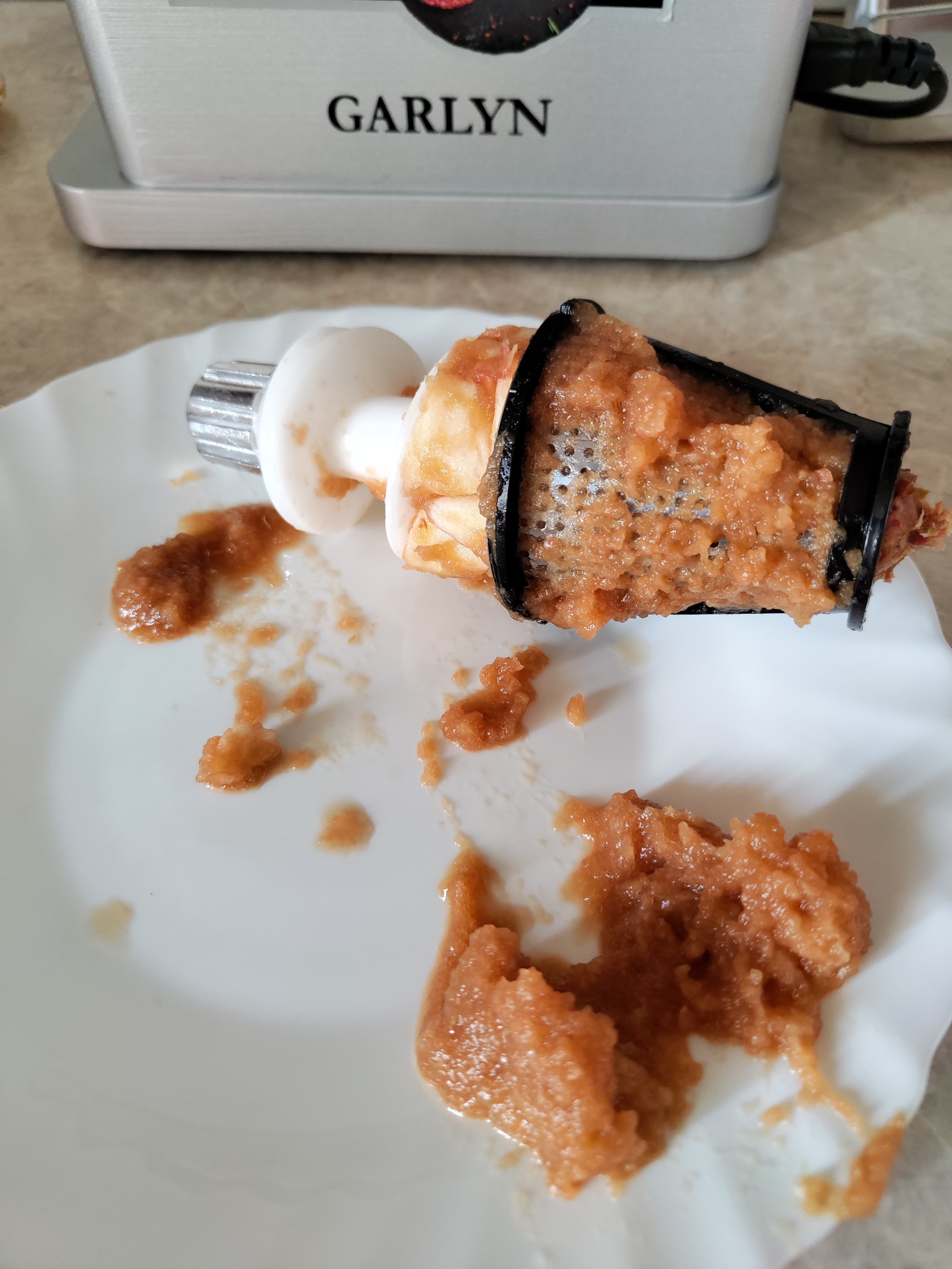 Интересно было взглянуть и на содержимое корпуса. Внутри осталось однородное пюре (кстати, съедобное) и жмых на шнеке ближе к его узкой части.