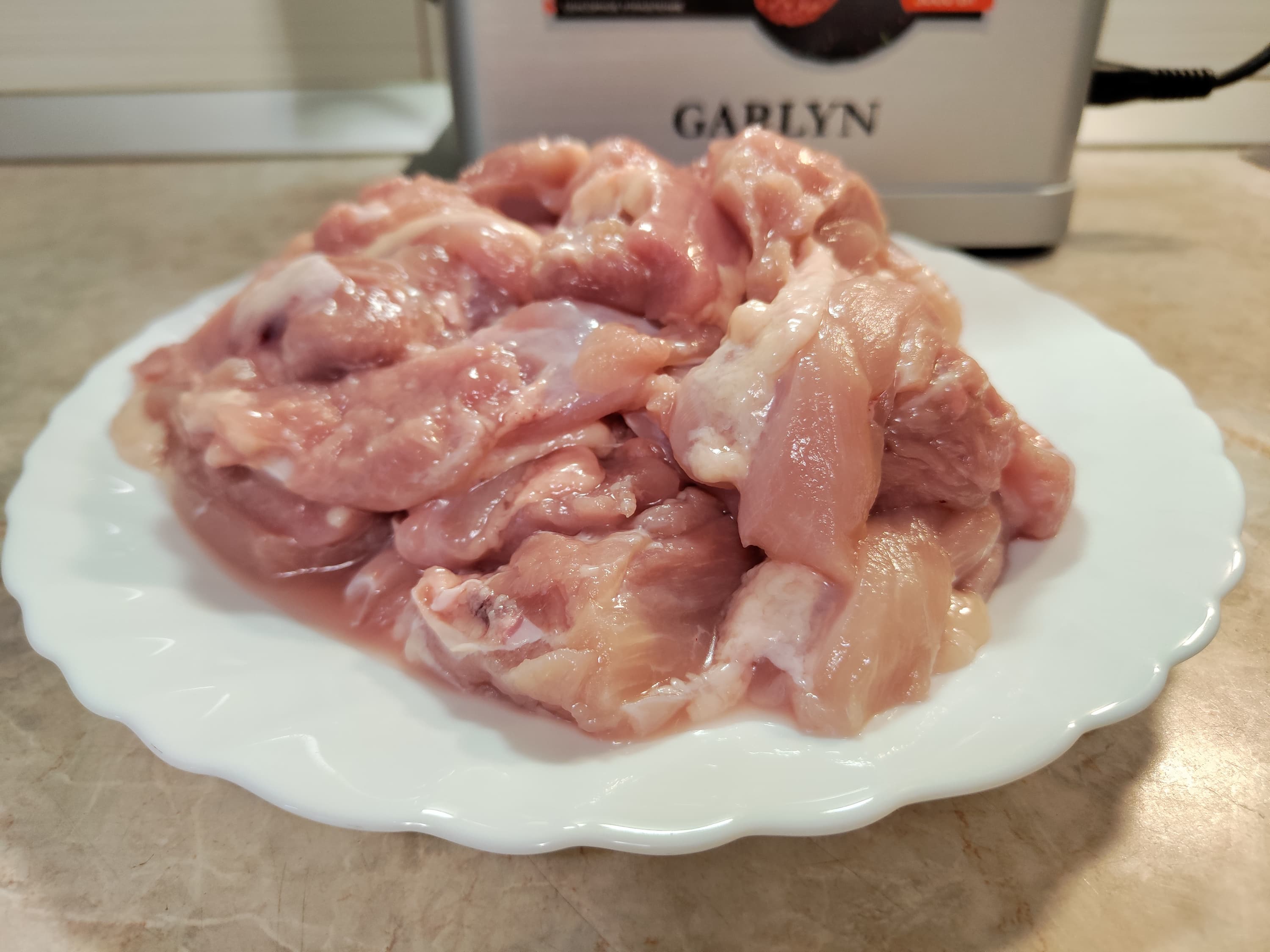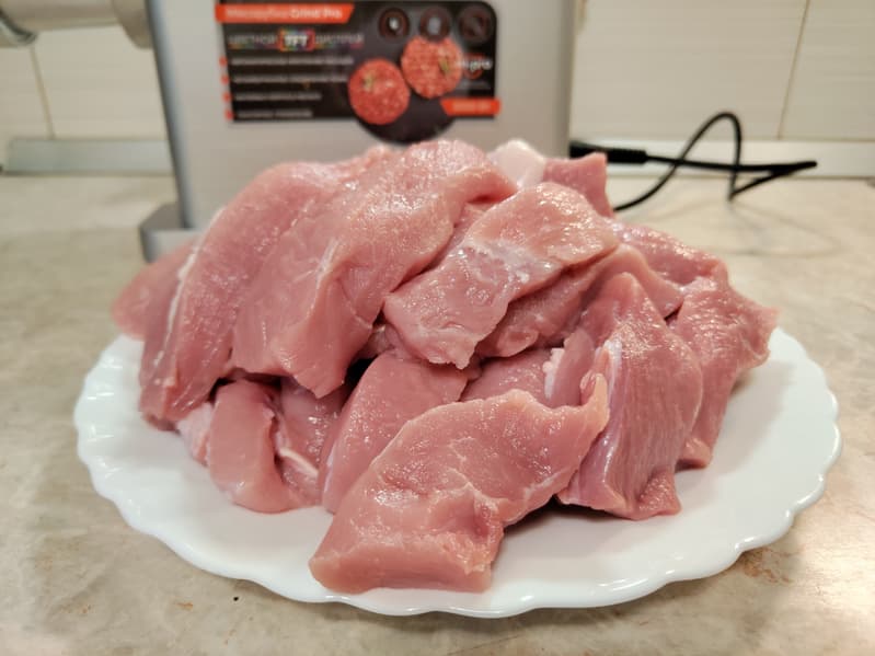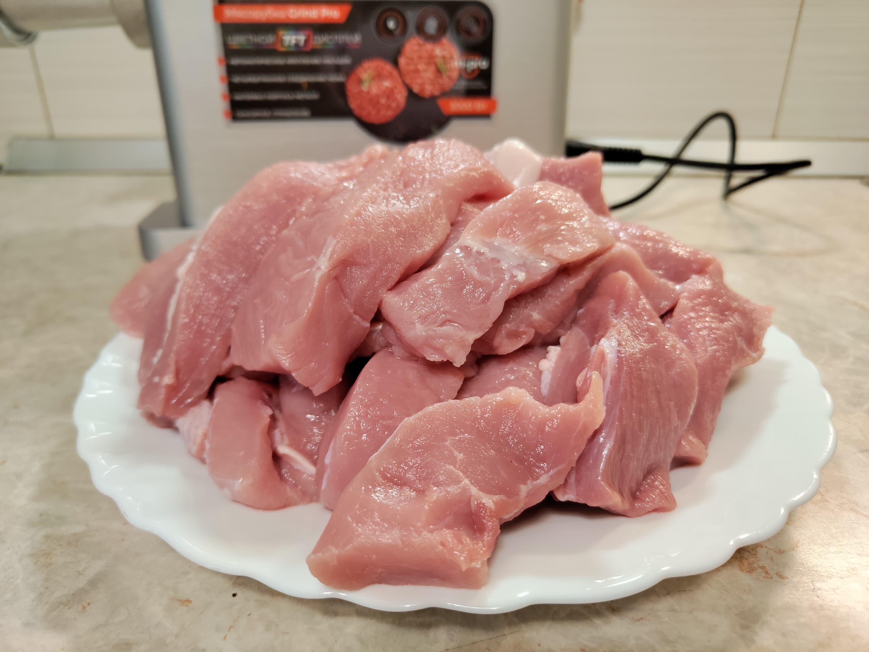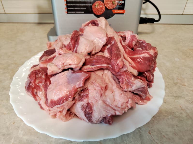 Свиной окорок был настолько чист, что с него даже не пришлось ничего удалять, мы лишь нарезали мясо на кусочки, свободно проходящие в загрузочное отверстие.