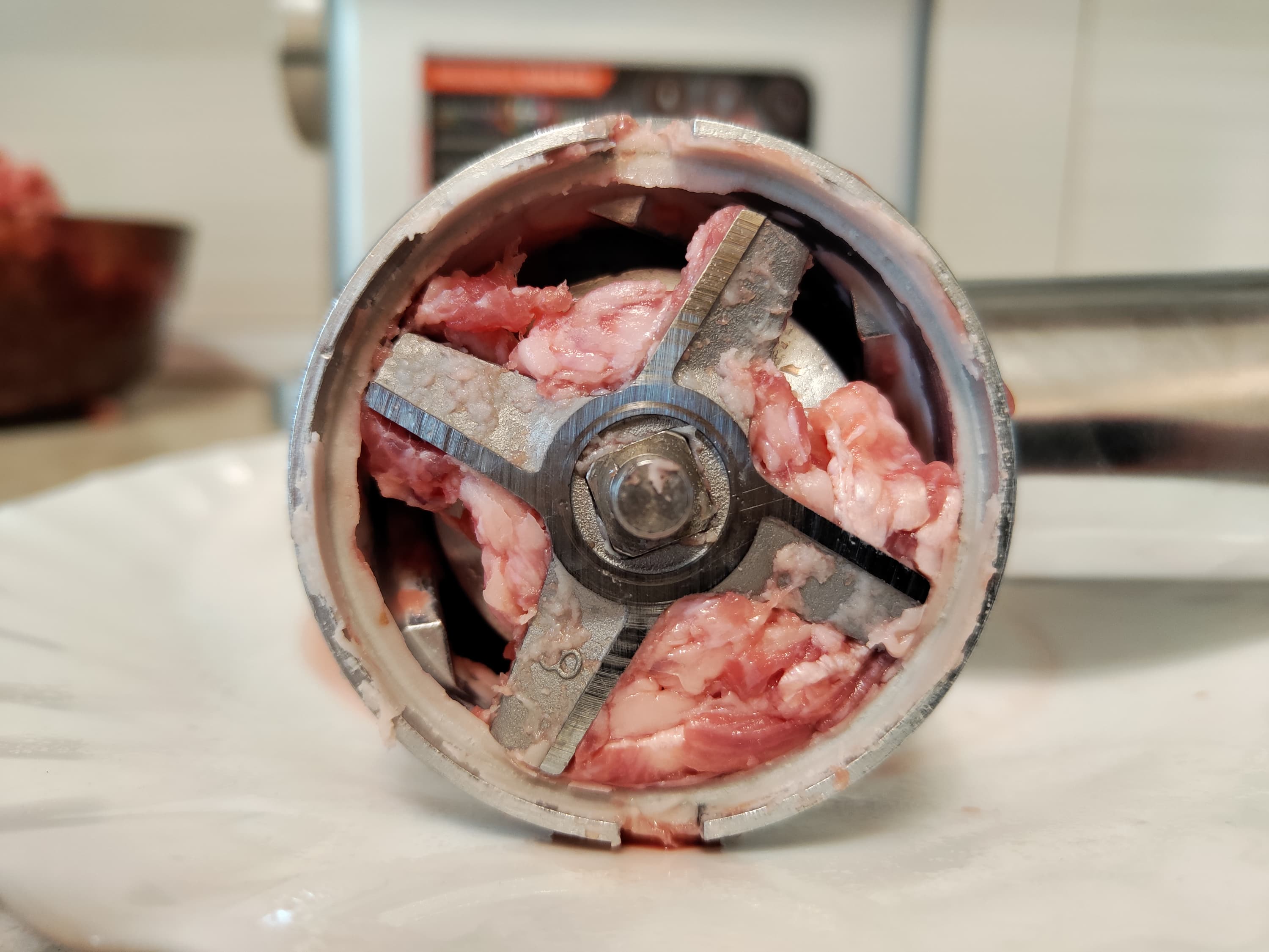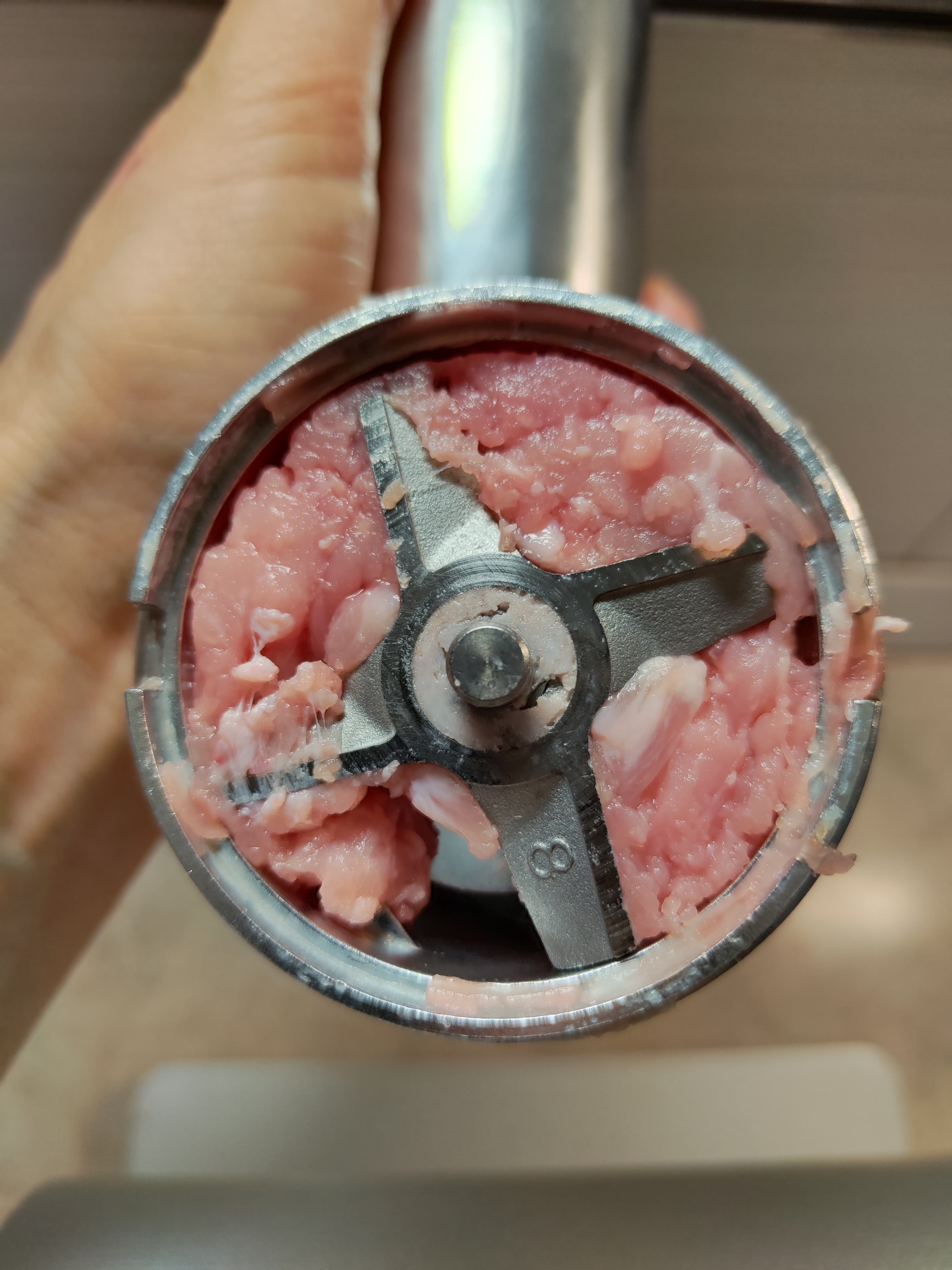 Мы опять решили использовать не самое простое для переработки сырье — филе бедра с жиром, жилками и неплотной структурой. Плохая мясорубка отвратительно измельчает такого типа мясо: жилки и жир не прорезаются, а накручиваются вокруг шнека и лезвий, в щели продавливается несчастное филе, в результате получается бесформенное нечто вместо аппетитного фарша. Судя по предыдущим тестам, сейчас всё должно пройти отлично.