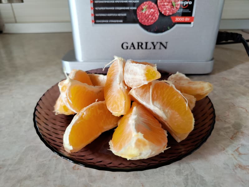 Из яблок отжать сок нам удалось, а как поведет себя соковыжималка с сочными апельсинами? Два апельсина очистили и разломали на дольки. Забегая вперед предупредим, что еще следовало удалить косточки.