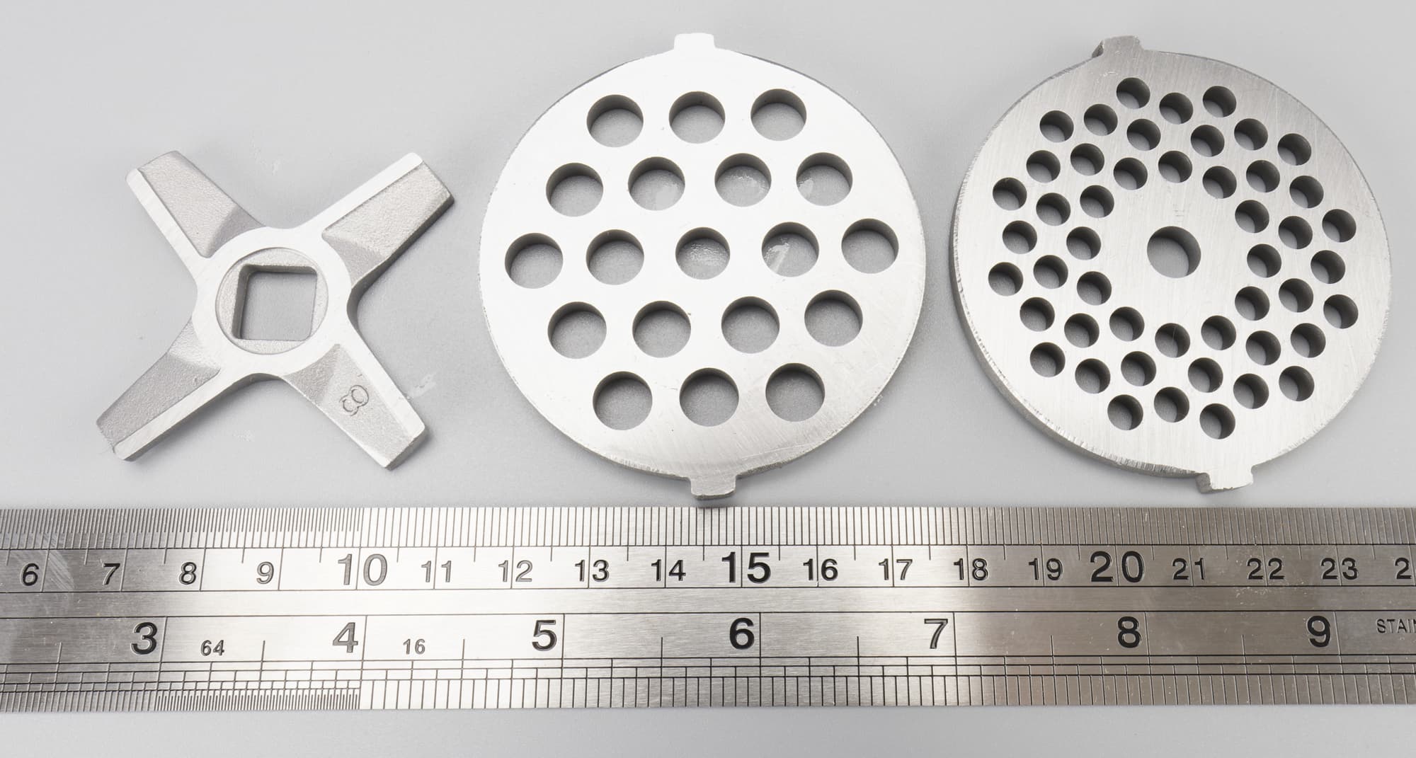 В комплект входят две перфорированные решетки с диаметром отверстий 7 и 5 мм. Обратим внимание на нож: он заточен с двух сторон, при работе с ним нужно быть аккуратным — заточка качественная, лезвия очень острые.