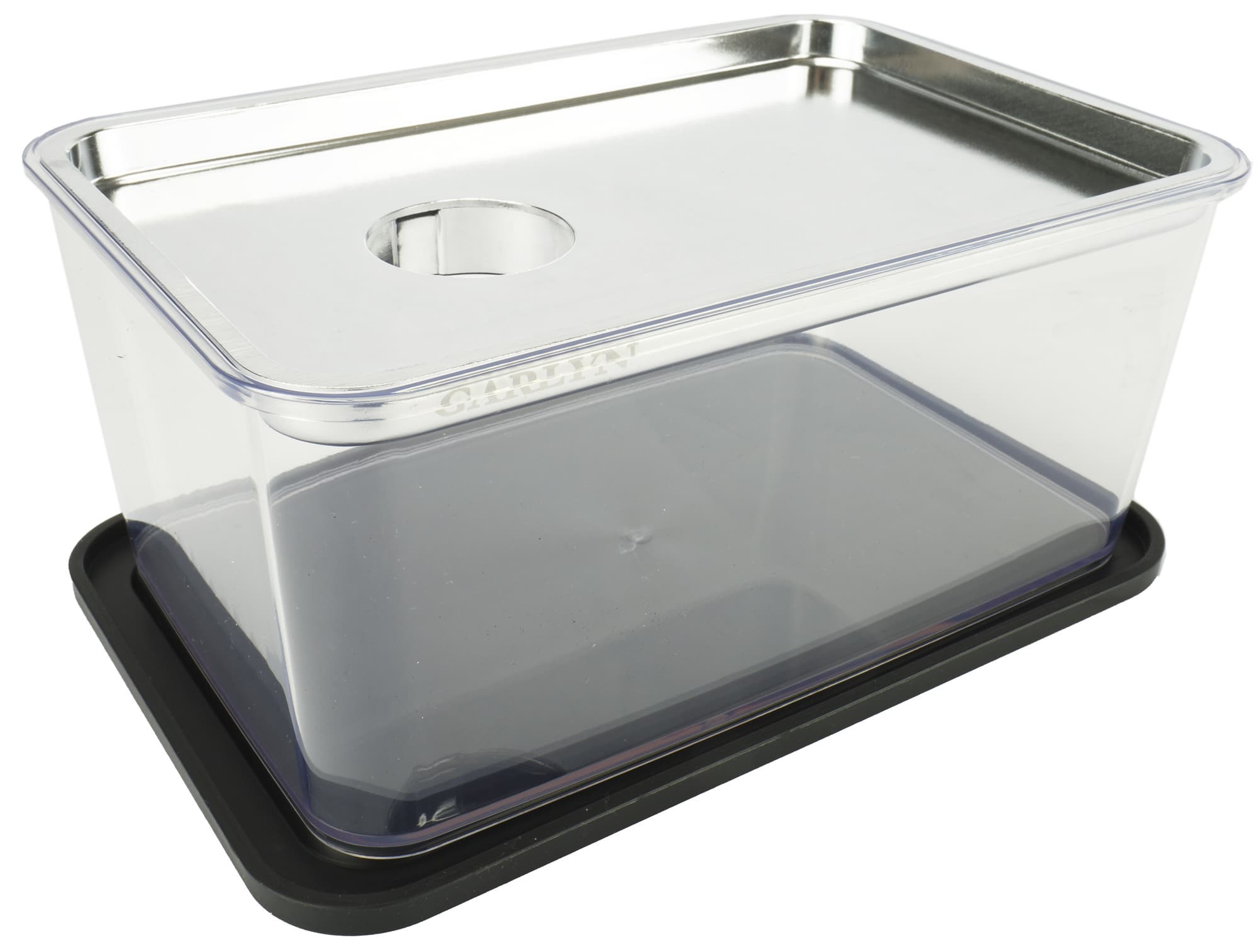 Помимо лотка, в контейнере можно хранить дополнительные аксессуары мясорубки Garlyn Grind Pro — толкатели, насадки для изготовления кеббе и колбасок, бургер-пресс. Перечисленные детали изготовлены из черного пластика и имеют обычную форму. Отметим лишь наличие двух формующих насадок для колбасок: одна диаметром 2, другая — 2,5 см.