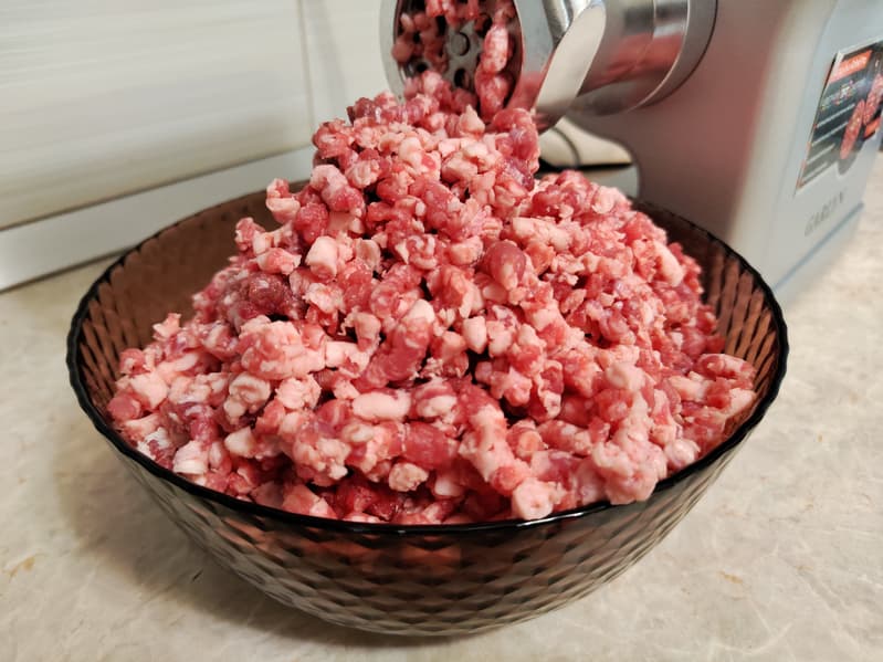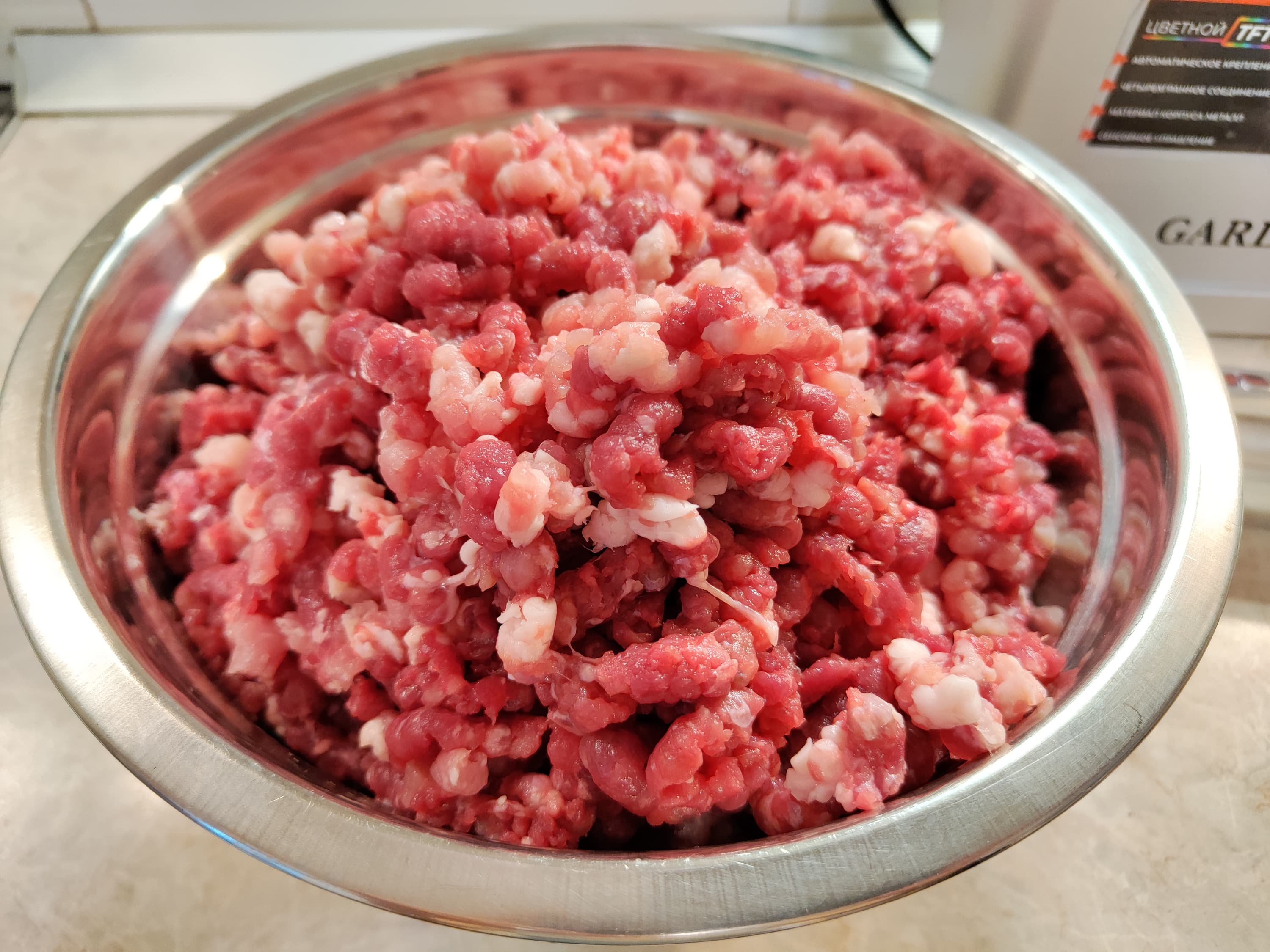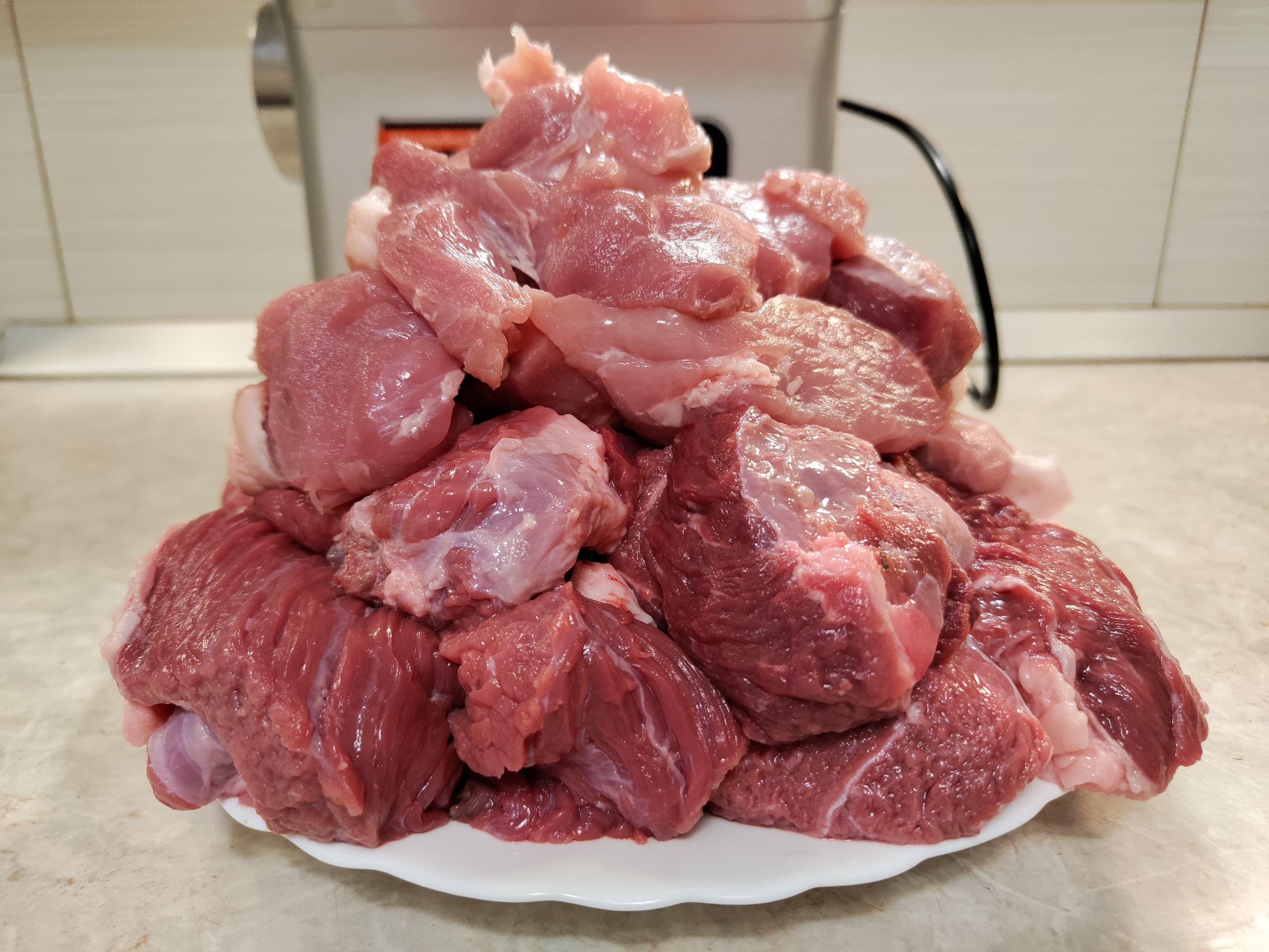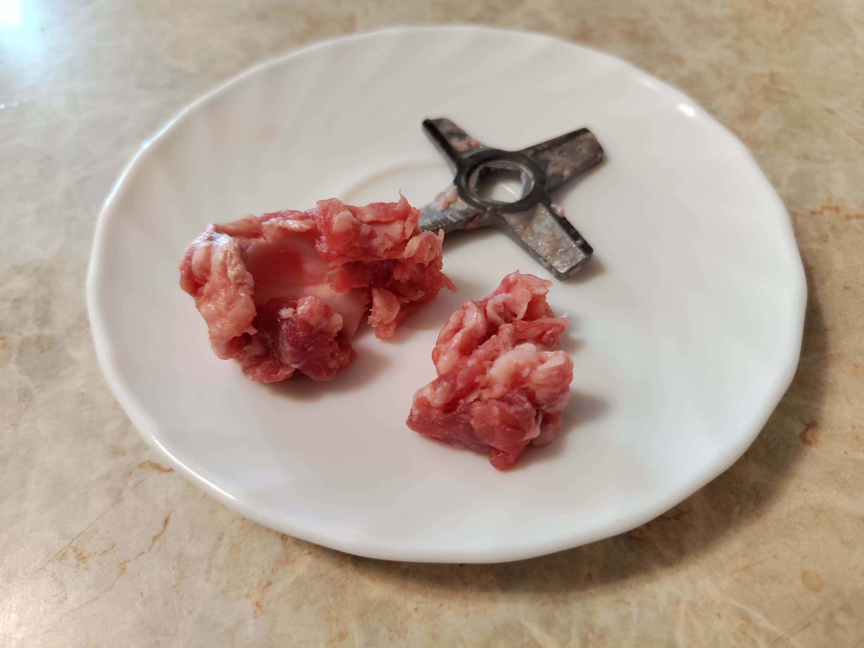 К этому тесту мы подготовились основательно: купили шейную часть говядины и свиной окорок. Мясо рубили на 6-й скорости через решетку с крупным диаметром отверстий.