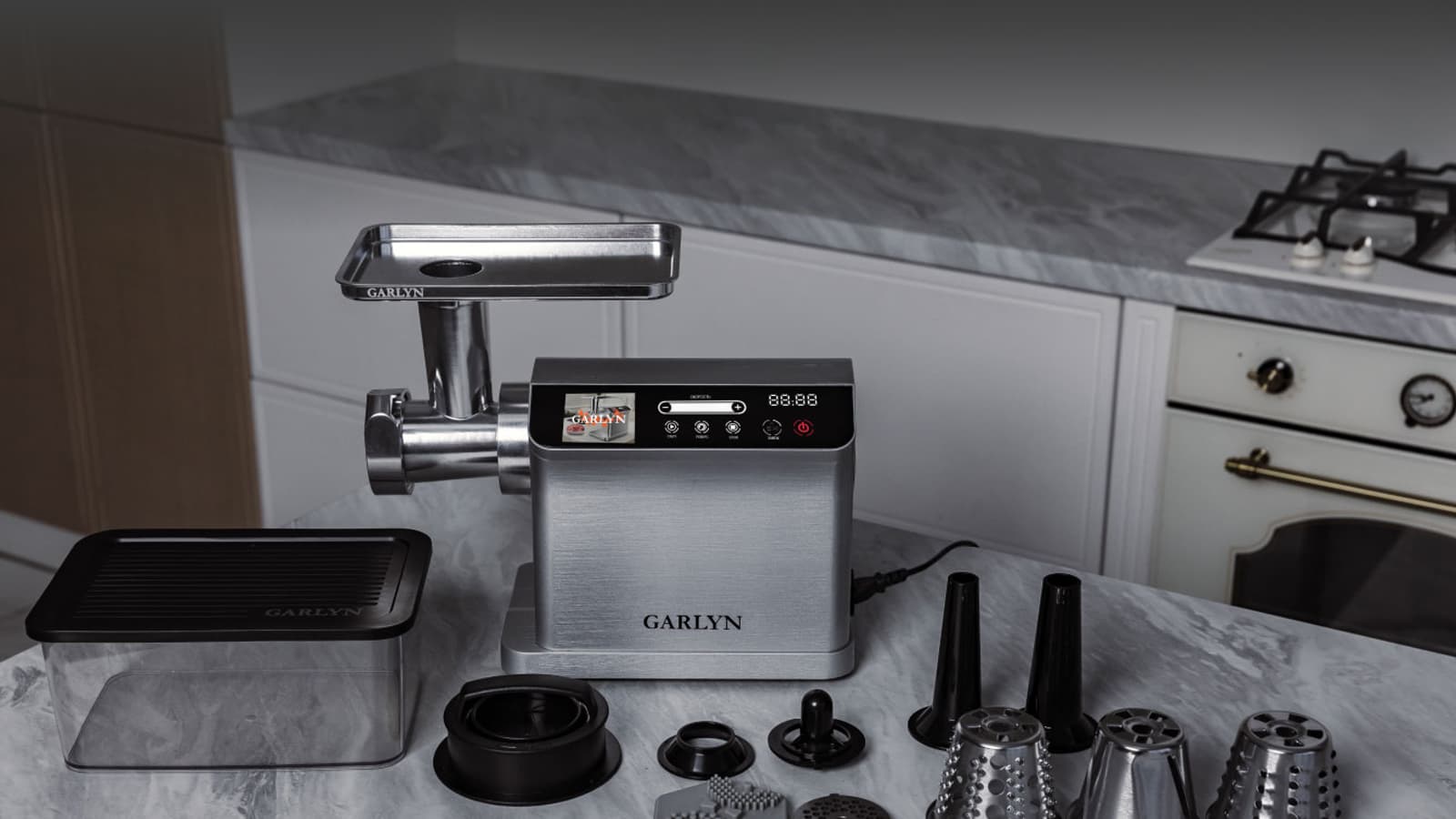 Казалось бы, придумать что-то новое в устройстве мясорубки — задача практически невыполнимая. Ан нет, Garlyn сделала неожиданное — оснастила корпус мясорубки цветным дисплеем и функцией автоматической фиксации насадок. Обещание производительности до 4 кг/мин мы пропустим мимо внимания, поскольку и 500 г/мин также удовлетворяют данному обещанию производителя. Однако у тестирования есть все шансы стать по-настоящему интересным и обширным — этому способствует большое количество насадок и приспособлений, входящих в комплект Garlyn Grind Pro.