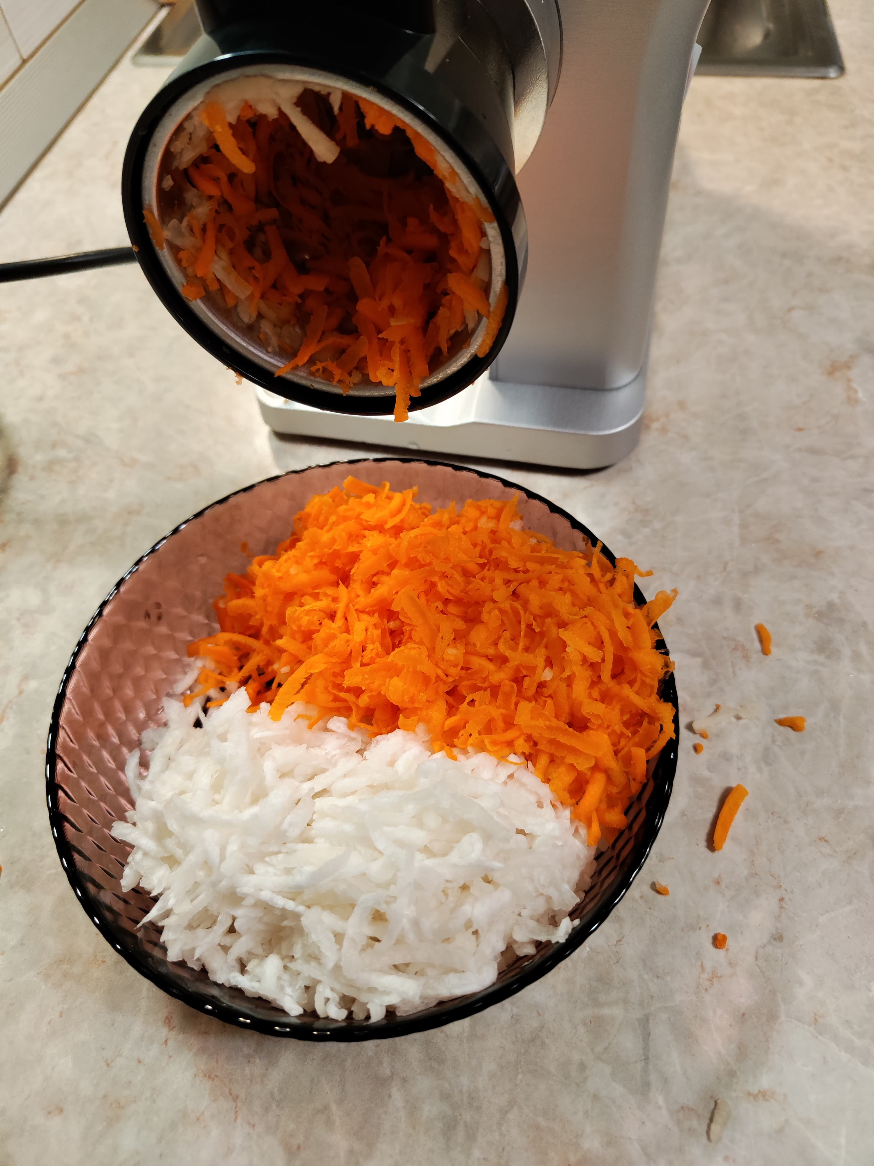 Натирали морковь и китайскую редьку (дайкон). За полторы минуты работы овощерезки на третьей скорости оба корнеплода были подготовлены для салата. Натирались морковь и редька быстро, ломтики получались ровные, примерно одинаковых размеров.