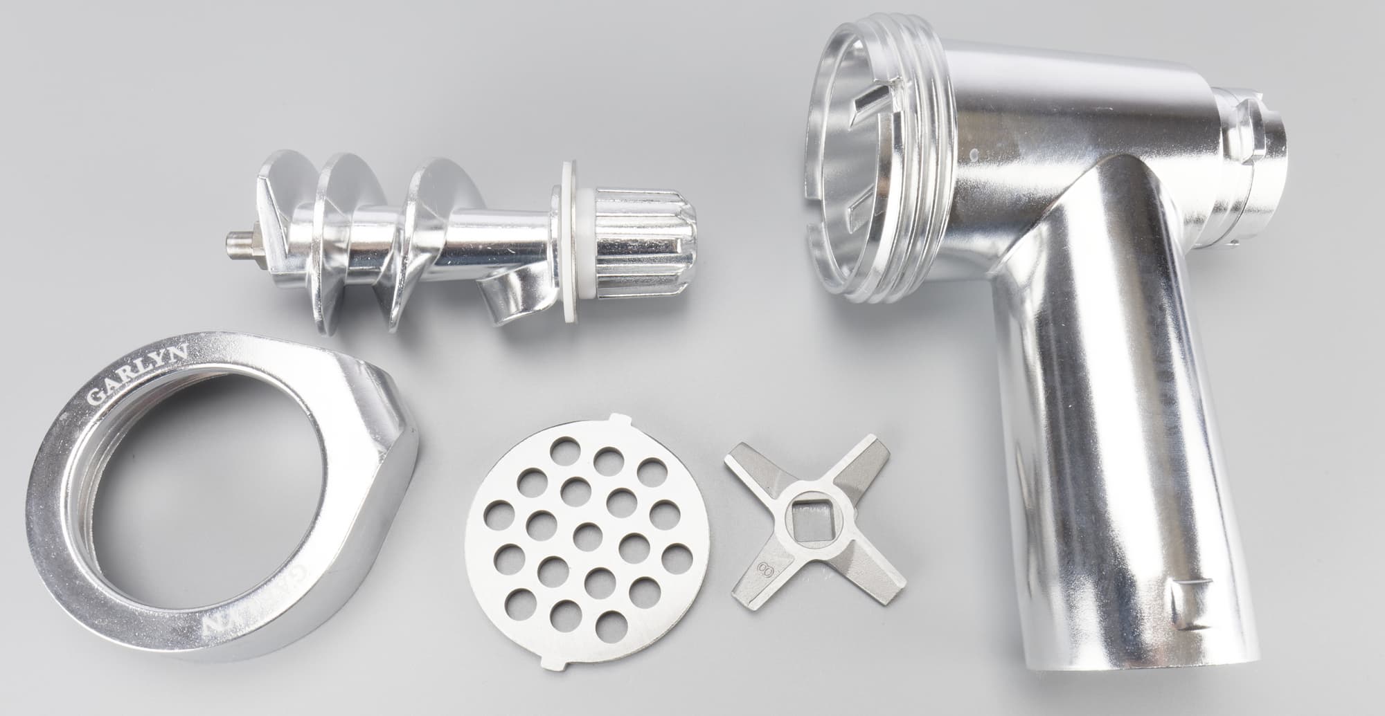 Корпус насадки-мясорубки изготовлен из алюминиевого сплава — силумина. Нож и перфорированные решетки стальные. Все металлические детали обработаны качественно, поверхности гладкие, без зазубрин и следов облоя. Длина корпуса стандартна и невелика, так что ухаживать за ним будет несложно — губка спокойно достанет до задней части внутренних стенок насадки.