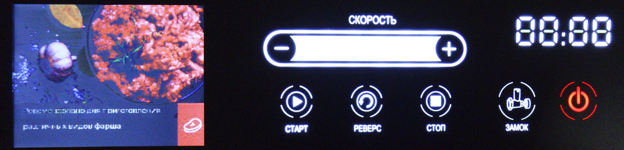 Далее всё интуитивно понятно и ожидаемо. После присоединения насадки нужно лишь выбрать скорость работы при помощи кнопок «+» и «−» и нажать «Старт». Для остановки следует надавить на кнопку «Стоп». В правом верхнем углу происходит отсчет времени работы. Нажатие на «Замок» отсоединяет насадку. При всей нелюбви автора к электронному управлению, он не может не признать, что сенсорная панель однозначно удобнее, чем гладкие механические ручки, которые невозможно повернуть испачканными при изготовлении фарша руками.
