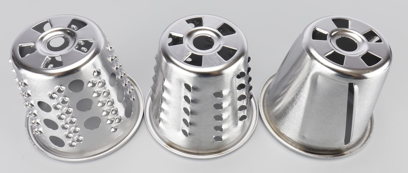 Три барабана позволят нарезать ломтиками, нашинковать и натереть подходящие для переработки продукты. Барабаны металлические, лист металла толстый, не деформируется при сильном нажатии. Режущие кромки весьма острые, так что при взаимодействии с насадкой следует соблюдать осторожность.