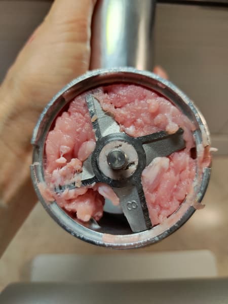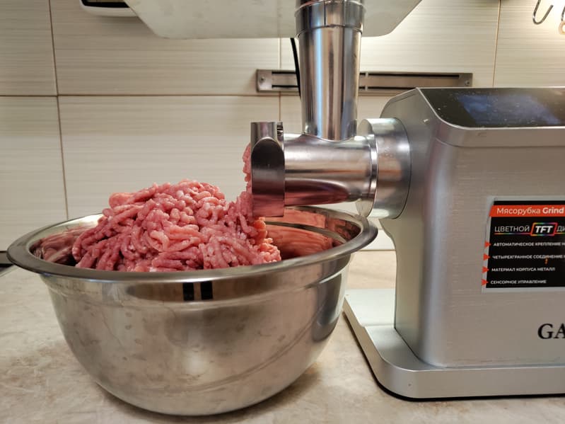 Да, мясорубка Garlyn Grind Pro не преподнесла никаких сюрпризов: фарш в миску поступал равномерными колбасками. Без малейших замечаний к работе прибора мы превратили в фарш среднего помола 1,1 кг филе куриных бедер.