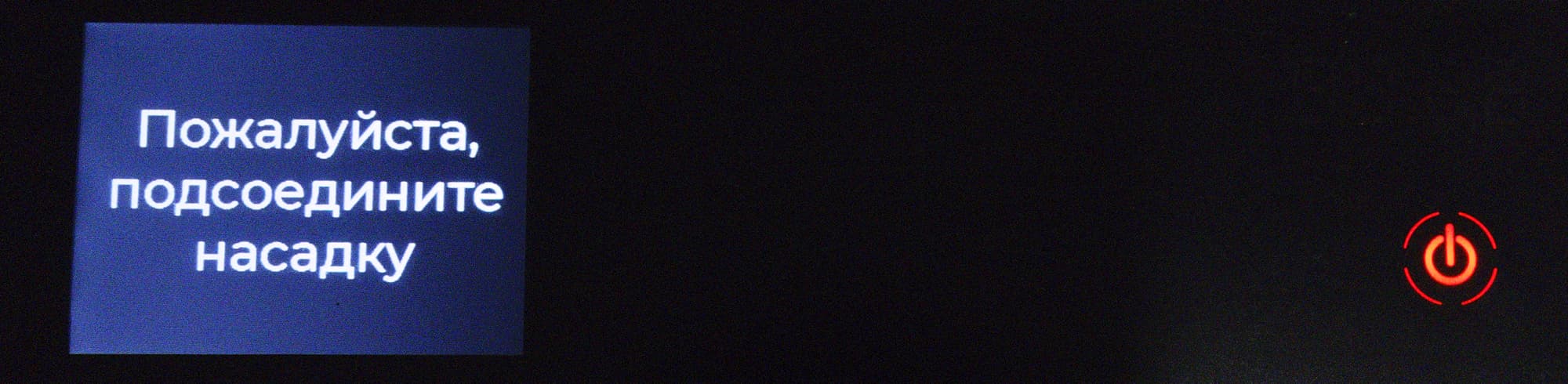 При подключении прибора в сеть звучит один короткий звуковой сигнал, на несколько секунд загорается вся панель, затем гаснет, и ярким красным цветом светит одна лишь кнопка включения. После нажатия на нее на дисплее загорается просьба присоединить насадку — а иначе с чем аппарату работать?