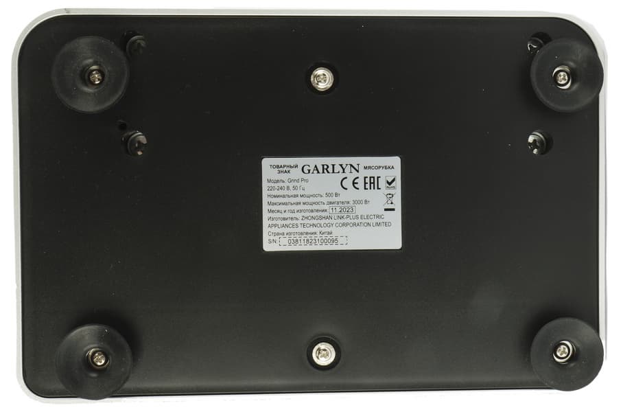 Со стороны дна расположены наклейка-шильдик с краткой информацией о мясорубке и четыре ножки, оснащенные резиновыми присосками в 3 см диаметром. Присоски надежно удерживают корпус на месте, что уже было отмечено выше, противодействуя скольжению и гася возникающие в ходе работы вибрации.
