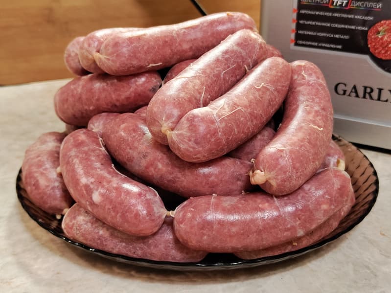 Всего набивка заняла около 40 минут. Бо́льшую часть этого времени мясорубка работала, паузы были заняты натягиванием оболочки и завязыванием узелков.