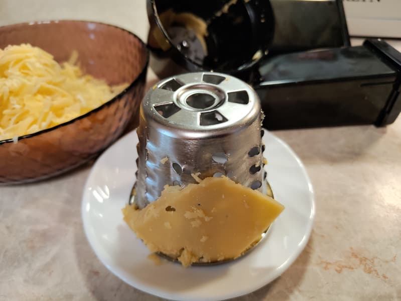 Натирали на 3-й скорости. Она оказалась идеальной для этого процесса, кусочки не разлетались, а аккуратно сбрасывались в небольшую миску. На фотографии можно видеть, что за пределами чашки оказалось буквально два-три фрагмента. Быстро и совсем без усилий мы натерли около 150 г сыра.