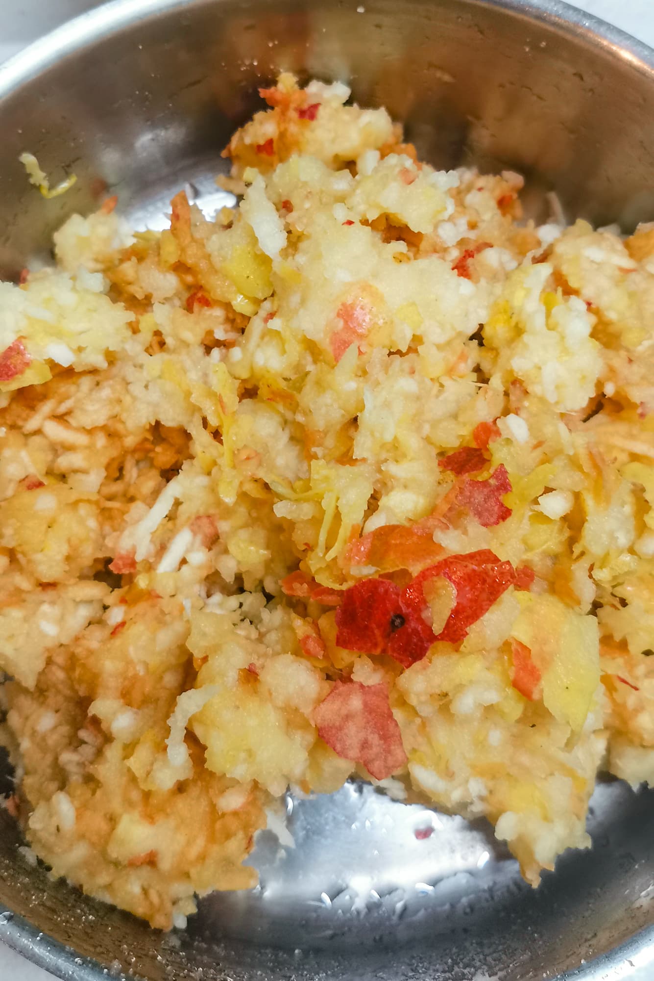 Мы натерли зимние яблоки, добавили муку, яйцо и корицу.