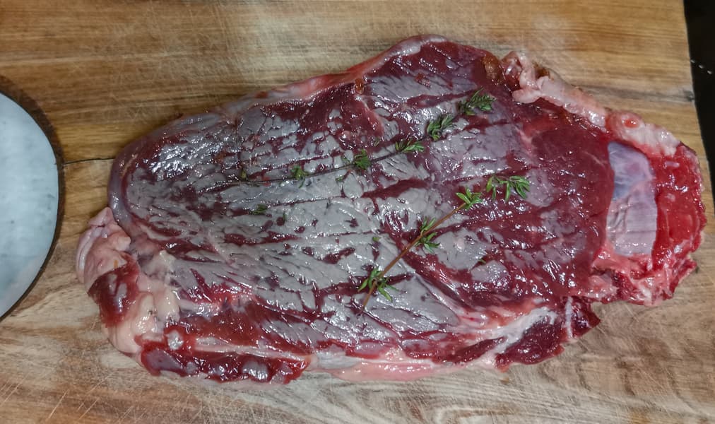 Мы взяли тонкий край говядины, срезали кость. Нагрели на сковороде масло, быстро смазали горячим маслом.