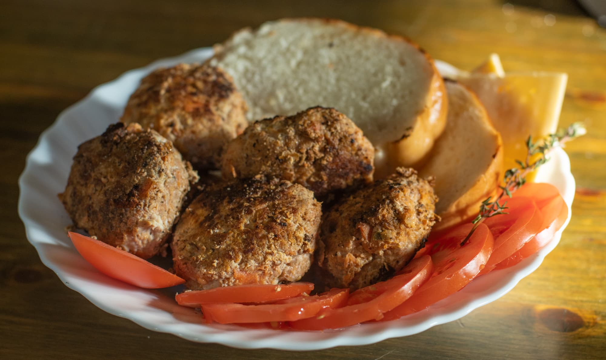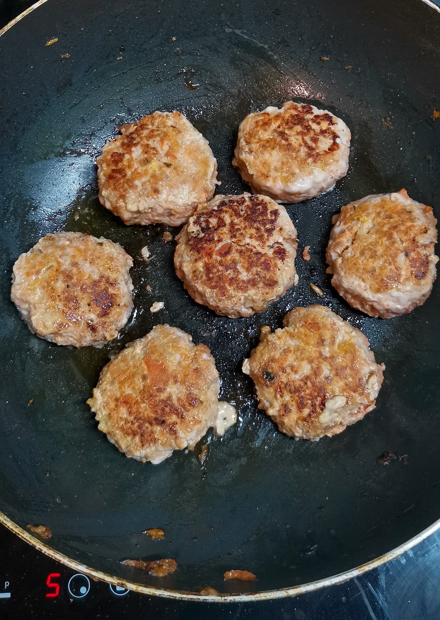 Мы добавили в фарш тертую морковь и специи, сформировали достаточно крупные котлеты. Обычно бывает достаточно сложно поджарить на сковороде большие котлеты так, чтобы они прожарились, но оставались сочными внутри и при этом не подгорели.