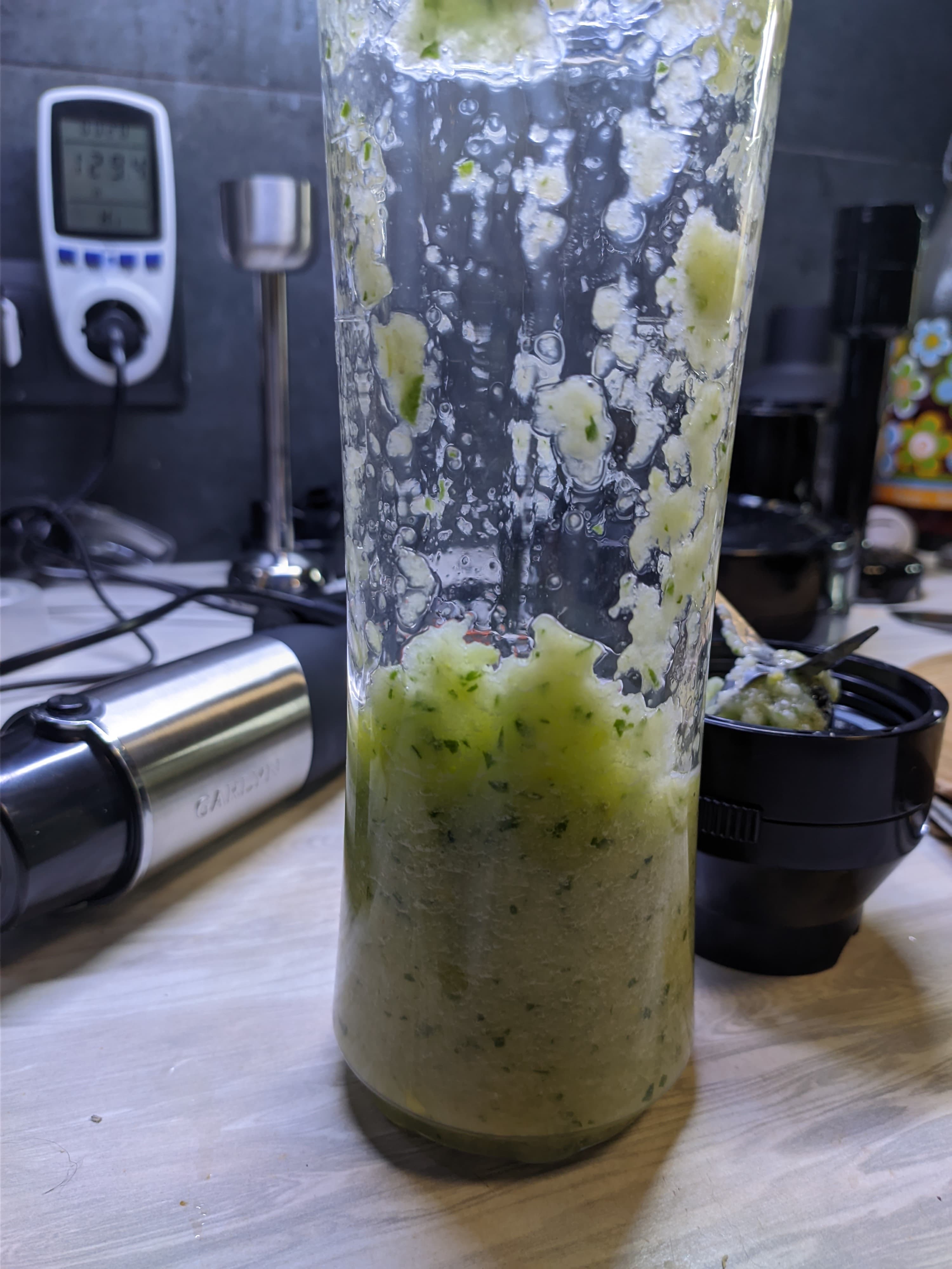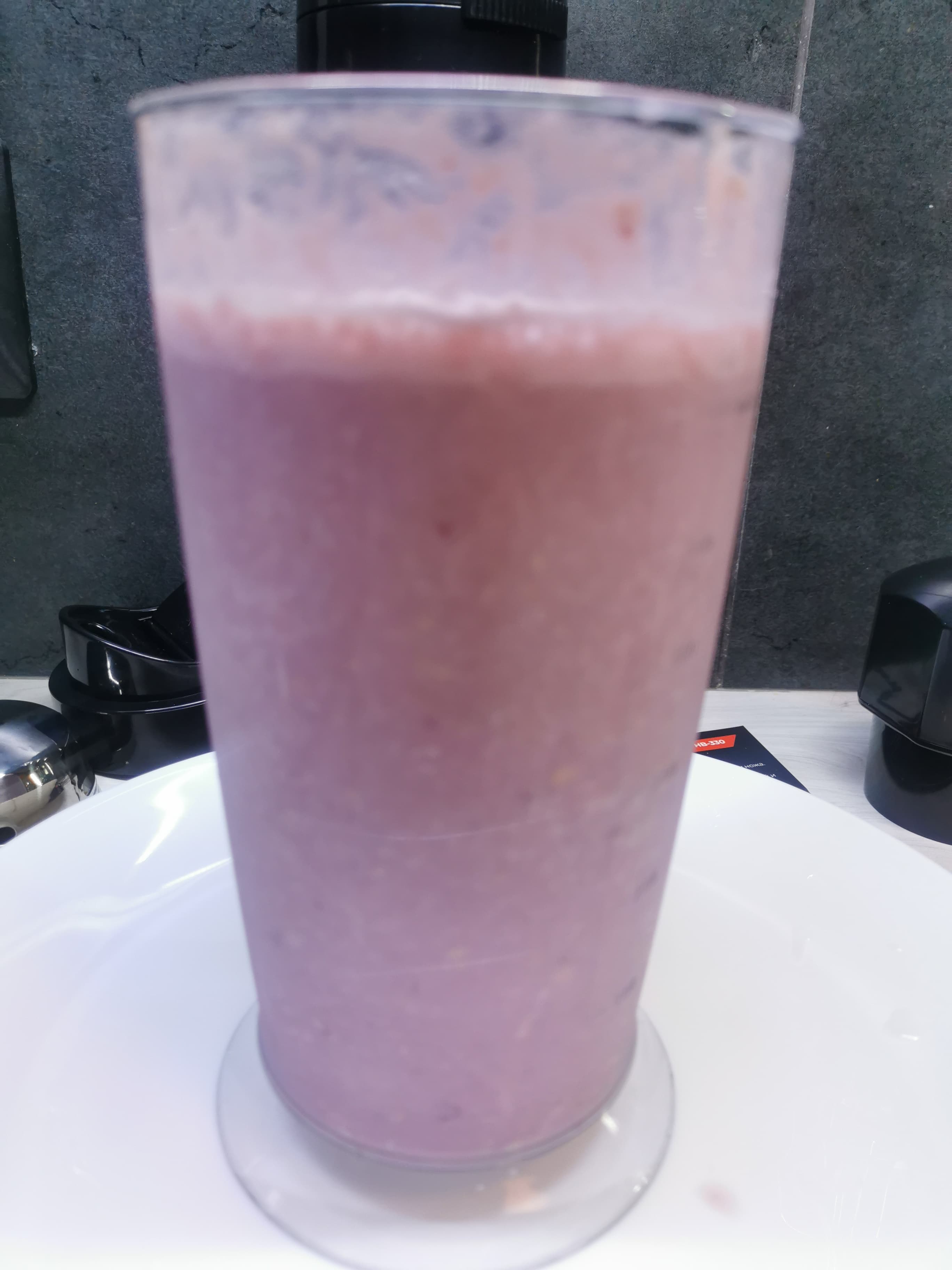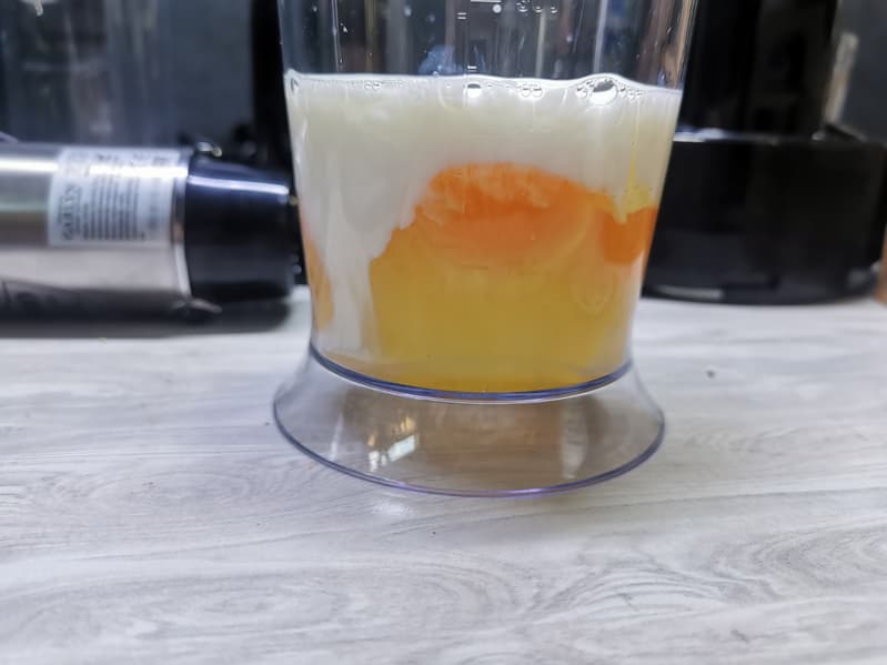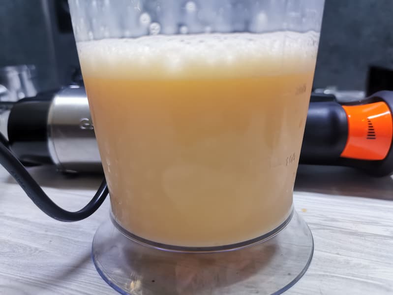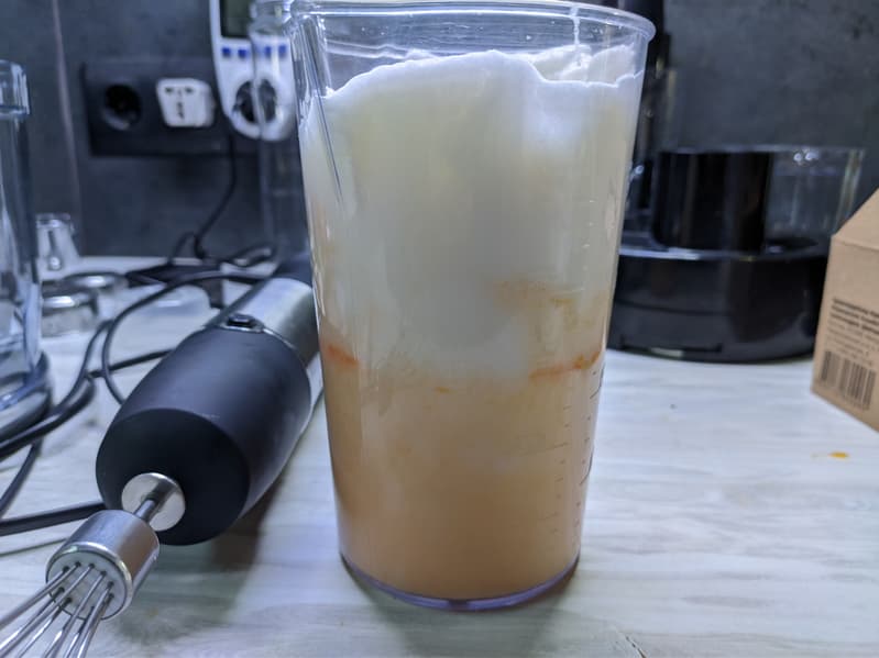 Однородная смесь была готова уже через 1 минуту на максимальном режиме, при этом никаких брызг не было — насадка-венчик и стакан для смешивания в комплекте отлично подходят друг для друга.