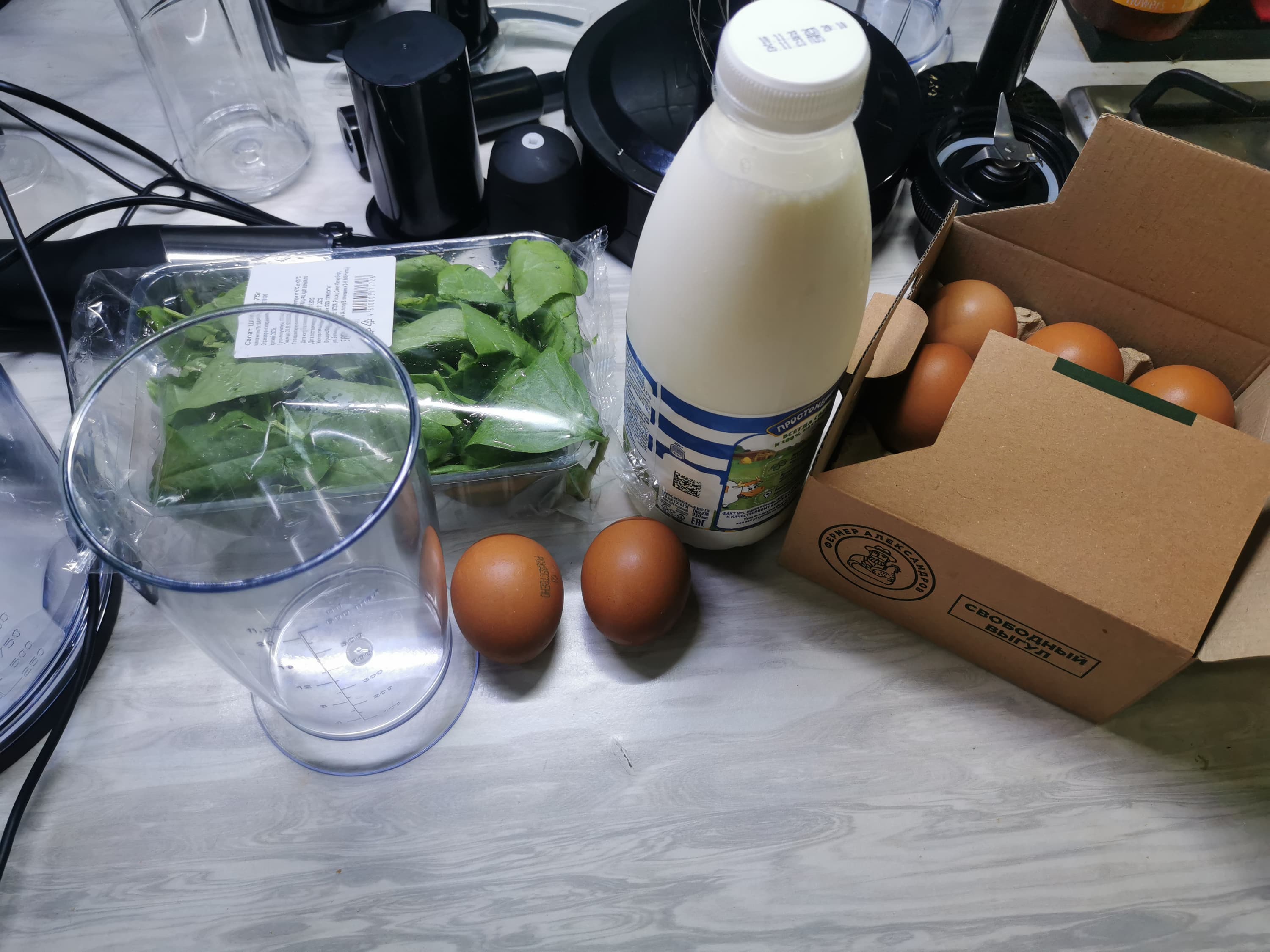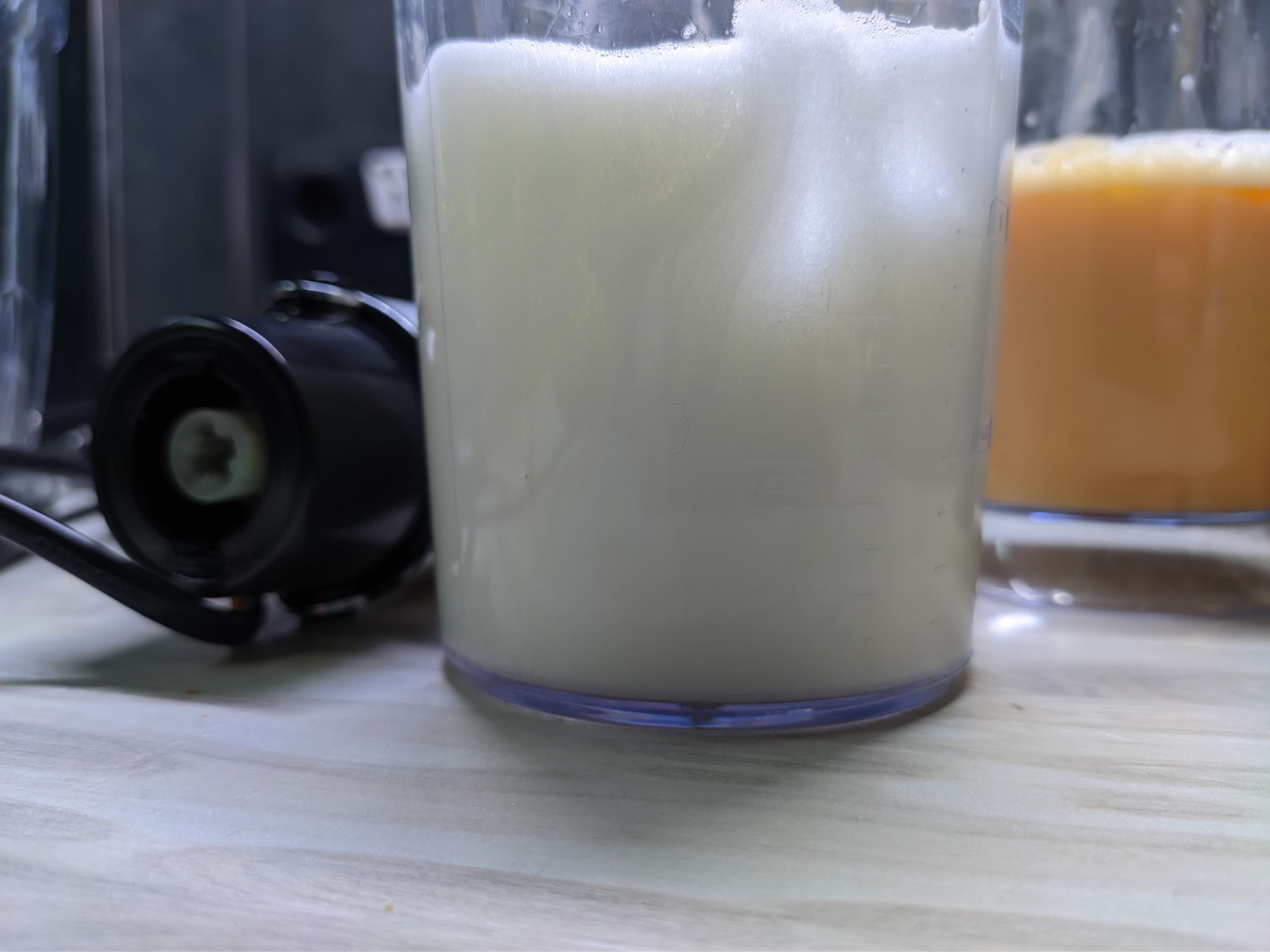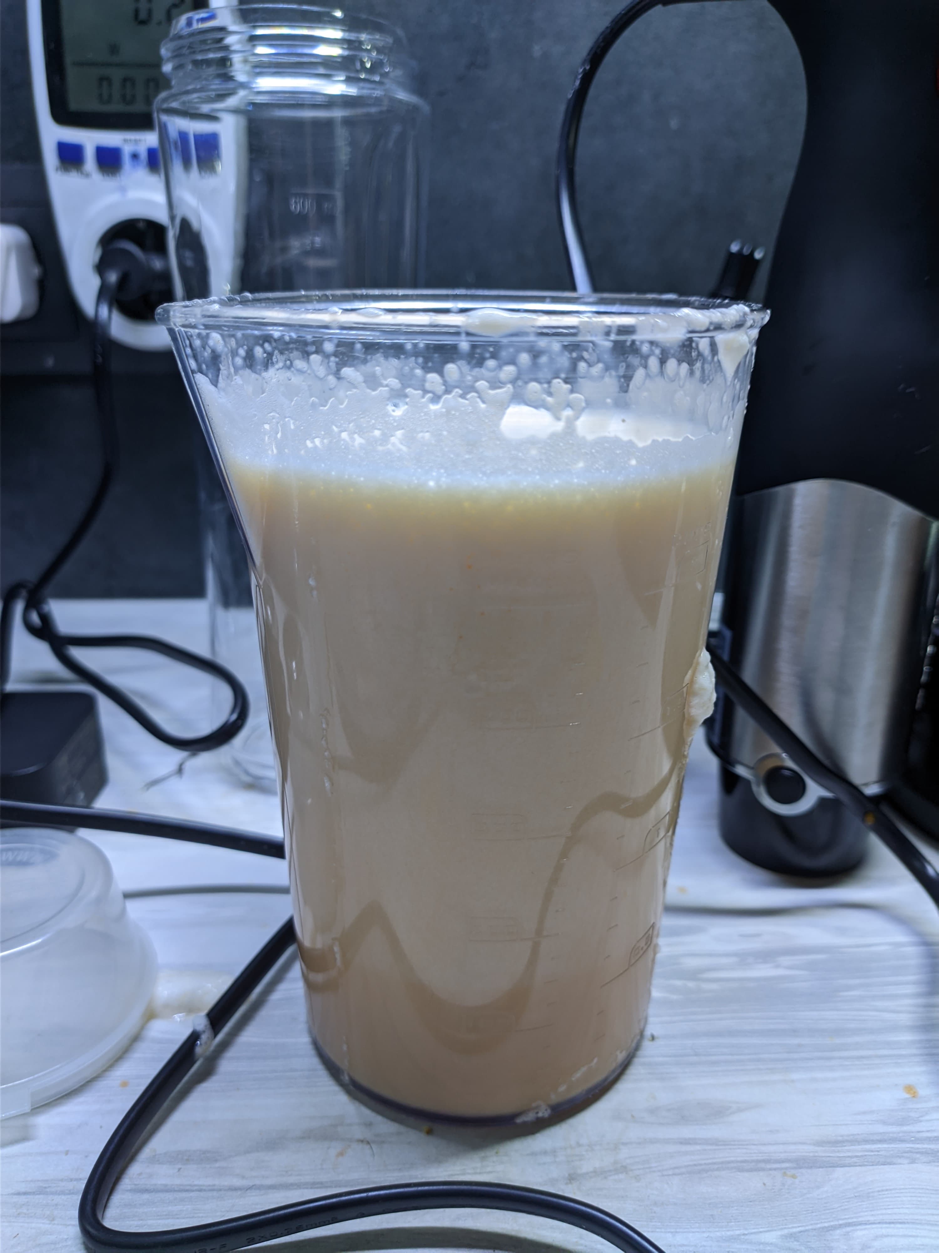 Однородная смесь была готова уже через 1 минуту на максимальном режиме, при этом никаких брызг не было — насадка-венчик и стакан для смешивания в комплекте отлично подходят друг для друга.