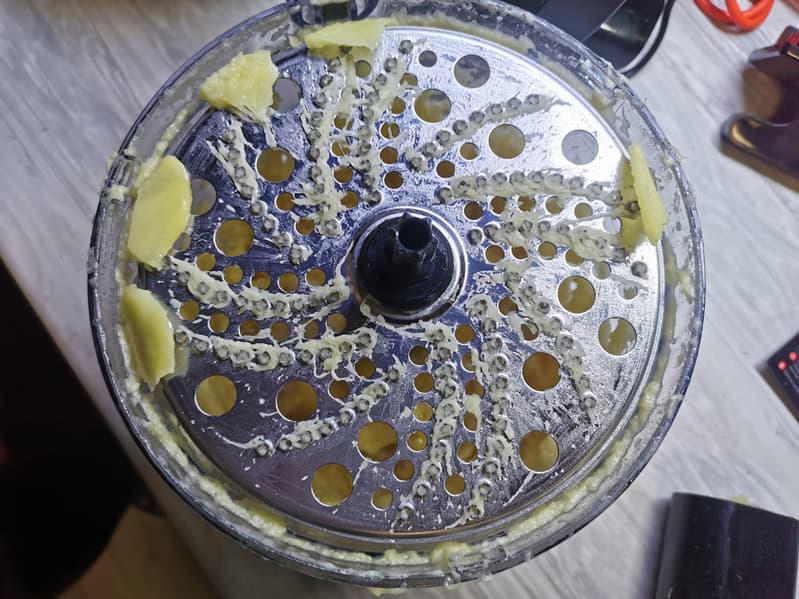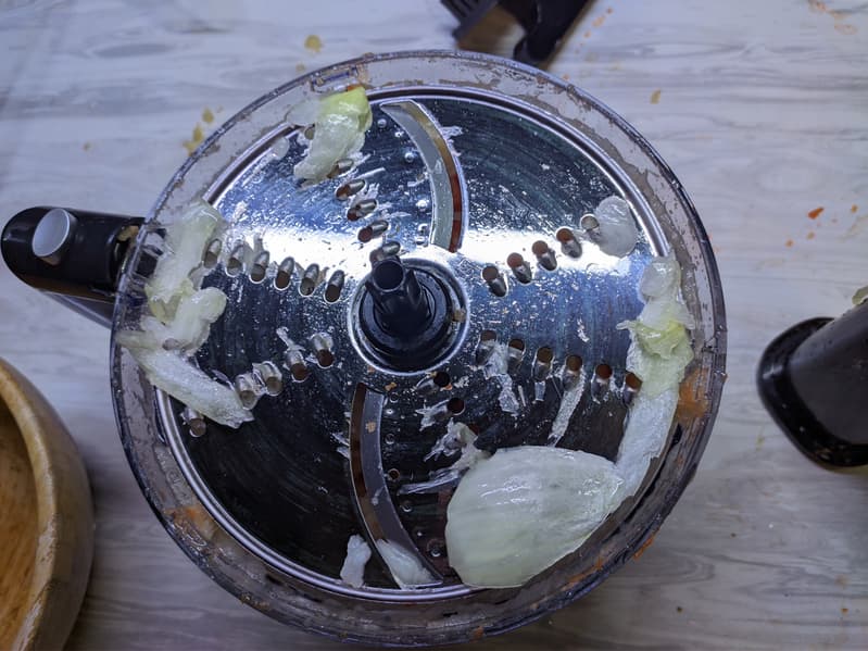 Тогда мы приступили к переработке лука, и, ожидаемо, он натирался куда хуже моркови. Многие слои лука оставались на диске и не могли натереться.
